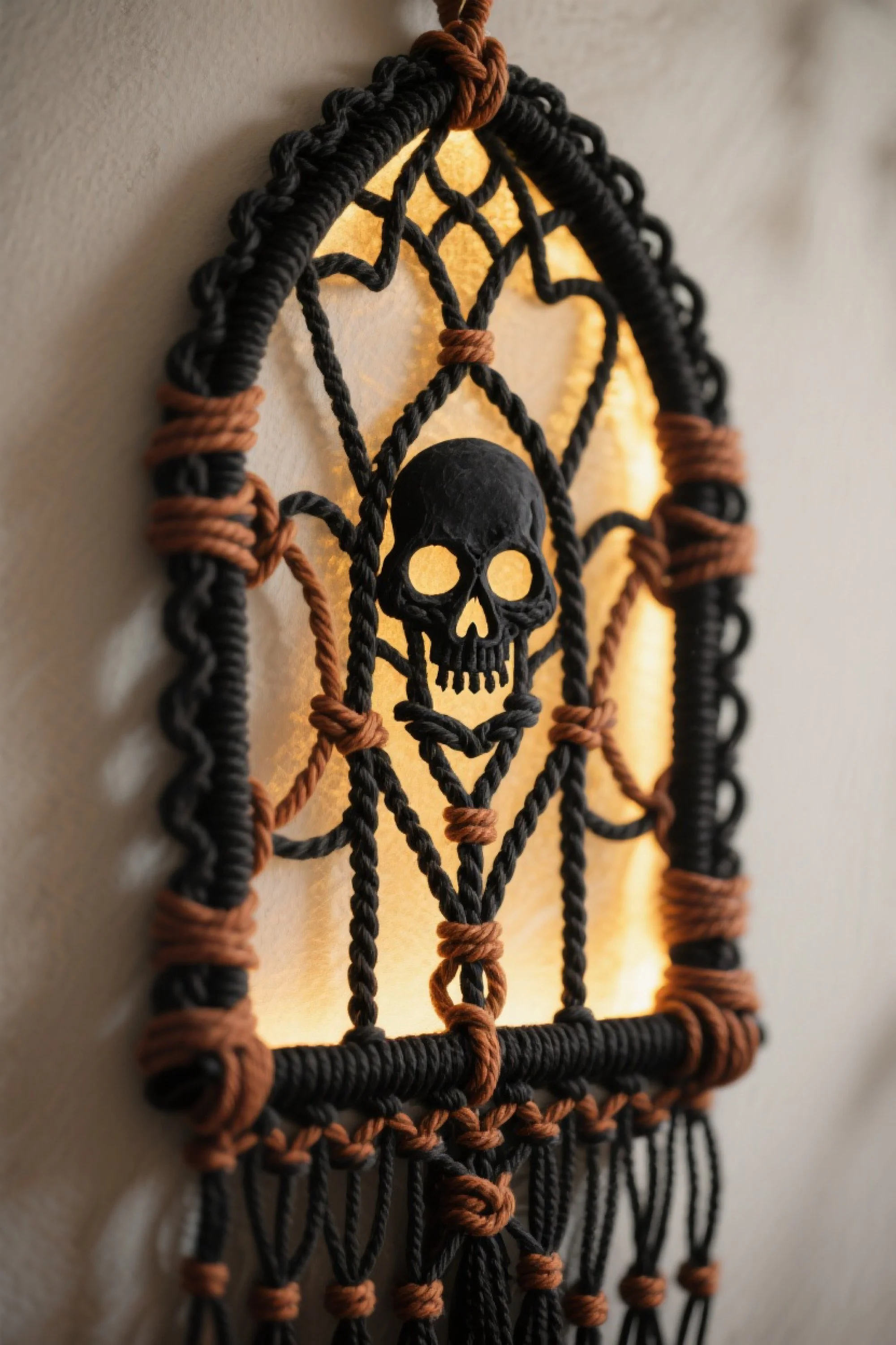 The Gothic Skull macrame wall hanging delivers an edgy, haunting vibe perfect for a moody Halloween aesthetic. Designed with an arched cathedral-style frame, the piece features intricate black knotwork accented with deep rust-brown wraps. At its center, a bold black skull motif commands attention, its hollow eyes illuminated by the soft glow of a backlit panel. The interplay of dark fibers and warm light creates a striking contrast that feels both eerie and artistic. The frame’s symmetrical design and careful knot spacing evoke stained glass windows, while the fringe at the bottom adds a tactile, handmade touch. This wall hanging works beautifully as a statement piece in a hallway, living room, or party setting—especially when paired with gothic or industrial-inspired décor.