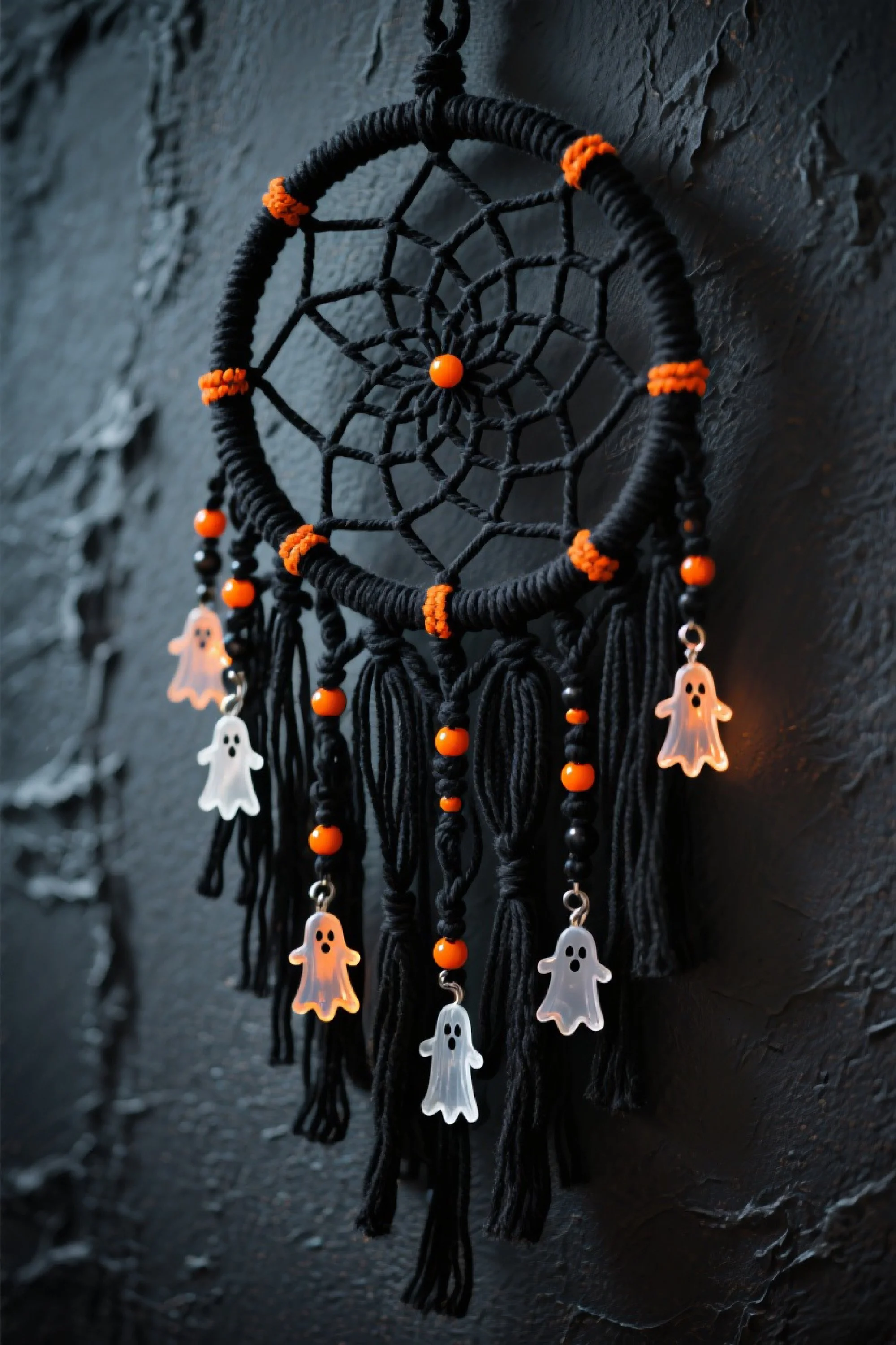 String orange and black beads onto the hanging cords, securing them in place with knots. At the end of each strand, attach a ghost charm using knot loops or small jump rings.