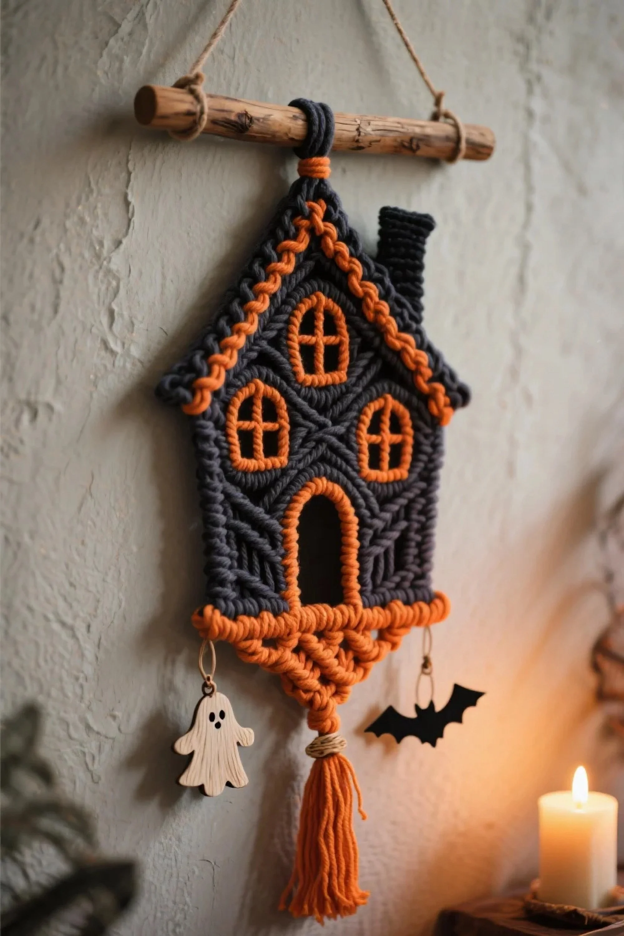 The goal is not just to make macrame Halloween-colored, but to make it undeniably Halloween-themed. A black and orange wall hanging might nod to the holiday, but a black and orange haunted house silhouette tells a story.
