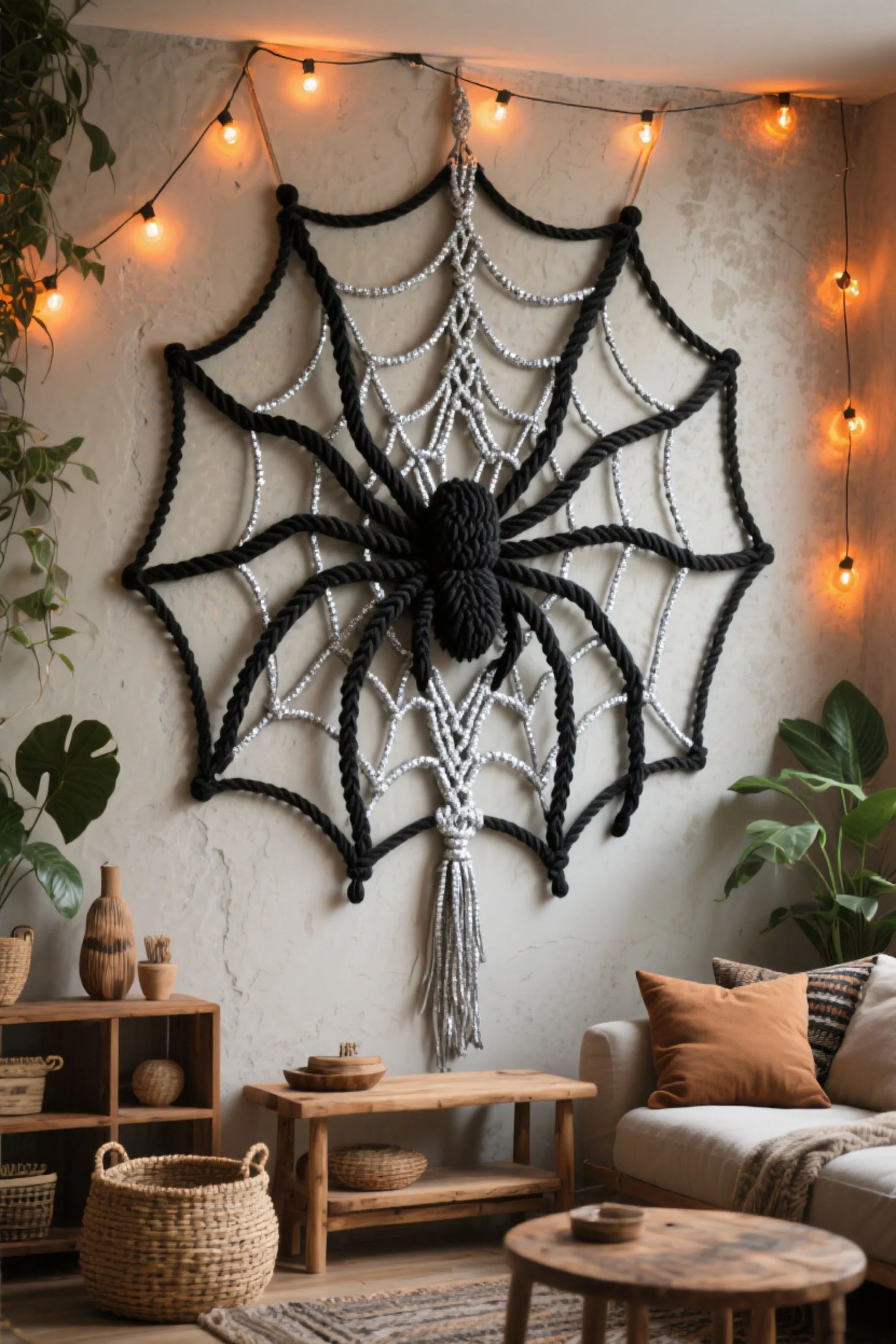 Texture also plays beautifully with lighting. The raised surfaces of knots catch shadows in candlelight, the fringe diffuses light from lanterns, and metallic threads or beads can glint in the glow of jack-o’-lanterns. By layering macrame pieces with existing light sources, you can create theatrical effects without adding a single battery-operated gadget.