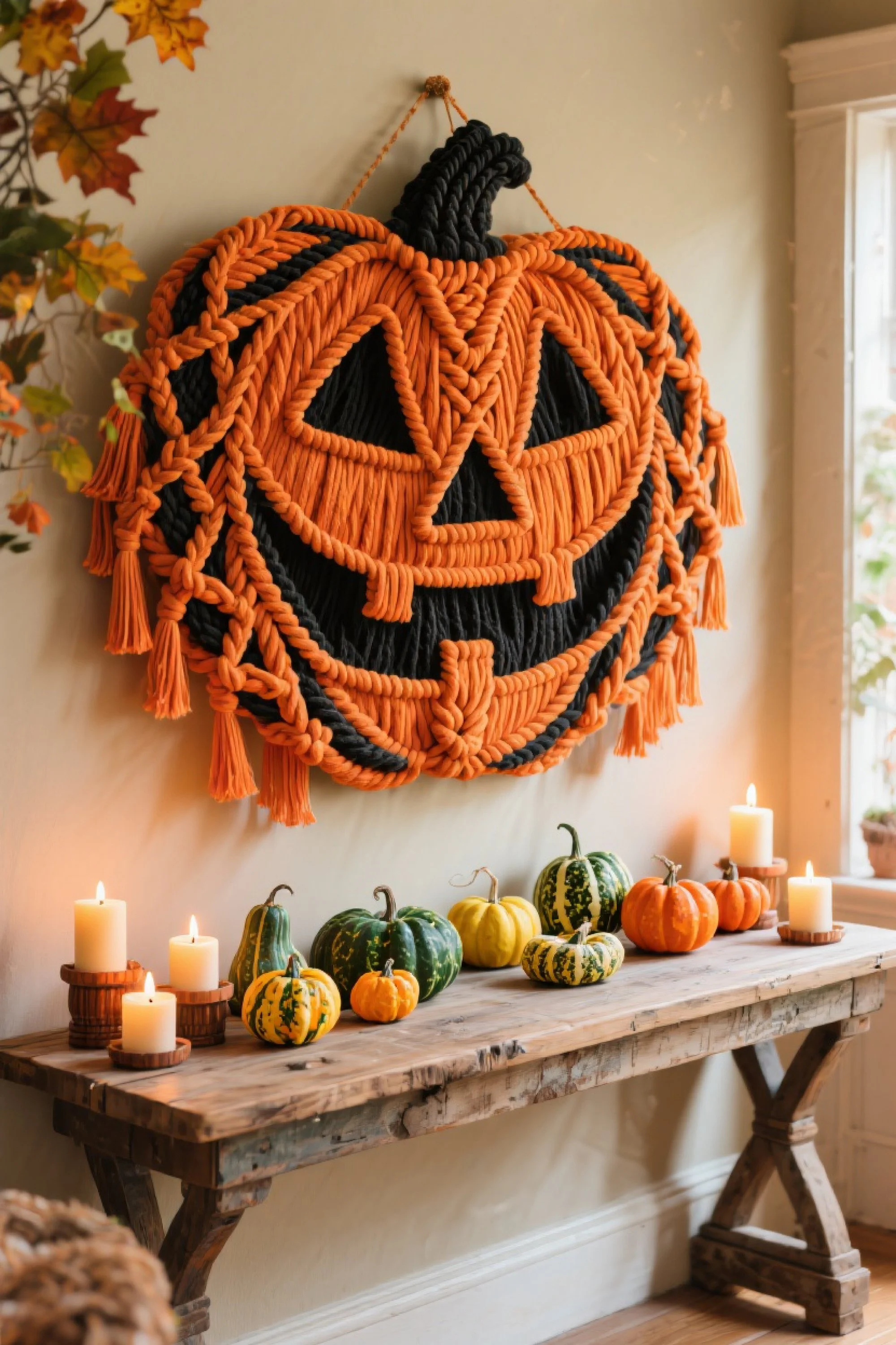 - Over the Fireplace Mantel: Anchor your mantel display with a macrame focal point surrounded by pumpkins and candles.