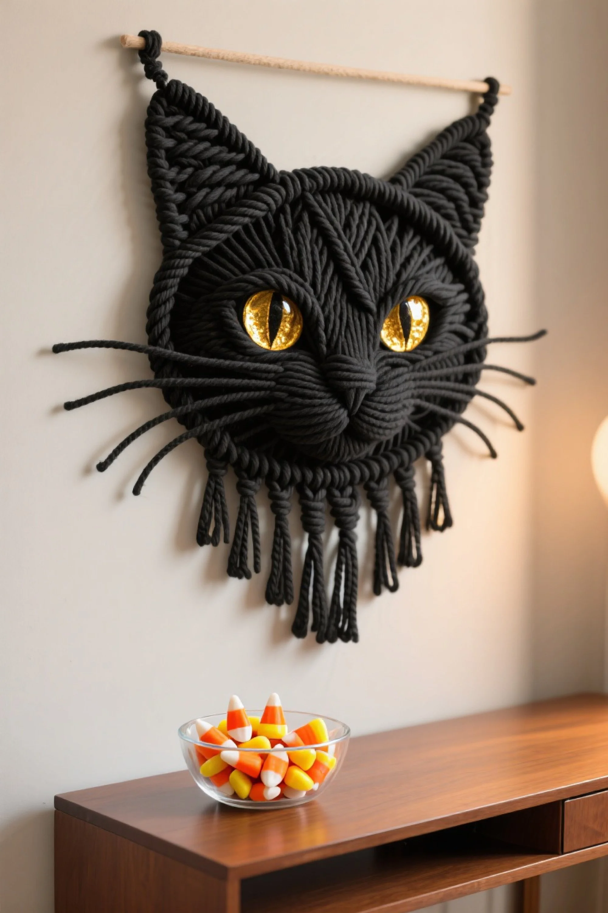 The Black Cat Familiar macrame wall hanging captures the mystery and charm of one of Halloween’s most beloved symbols. Crafted entirely from thick black cord, the cat’s head is formed with intricate knotwork that brings texture and dimension to its sleek silhouette. The most captivating feature is its gleaming golden eyes—set with feline pupils—that seem to follow you around the room, adding a touch of enchantment. The rounded face, upright ears, and delicately knotted muzzle are complemented by long cord whiskers that extend outward, giving the piece a playful, lifelike quality. Fringe tassels hang beneath the chin, grounding the design in traditional macrame style. Perfect for hanging above a console table, on a door, or as part of a Halloween wall gallery, this wall hanging blends spooky elegance with handmade artistry.