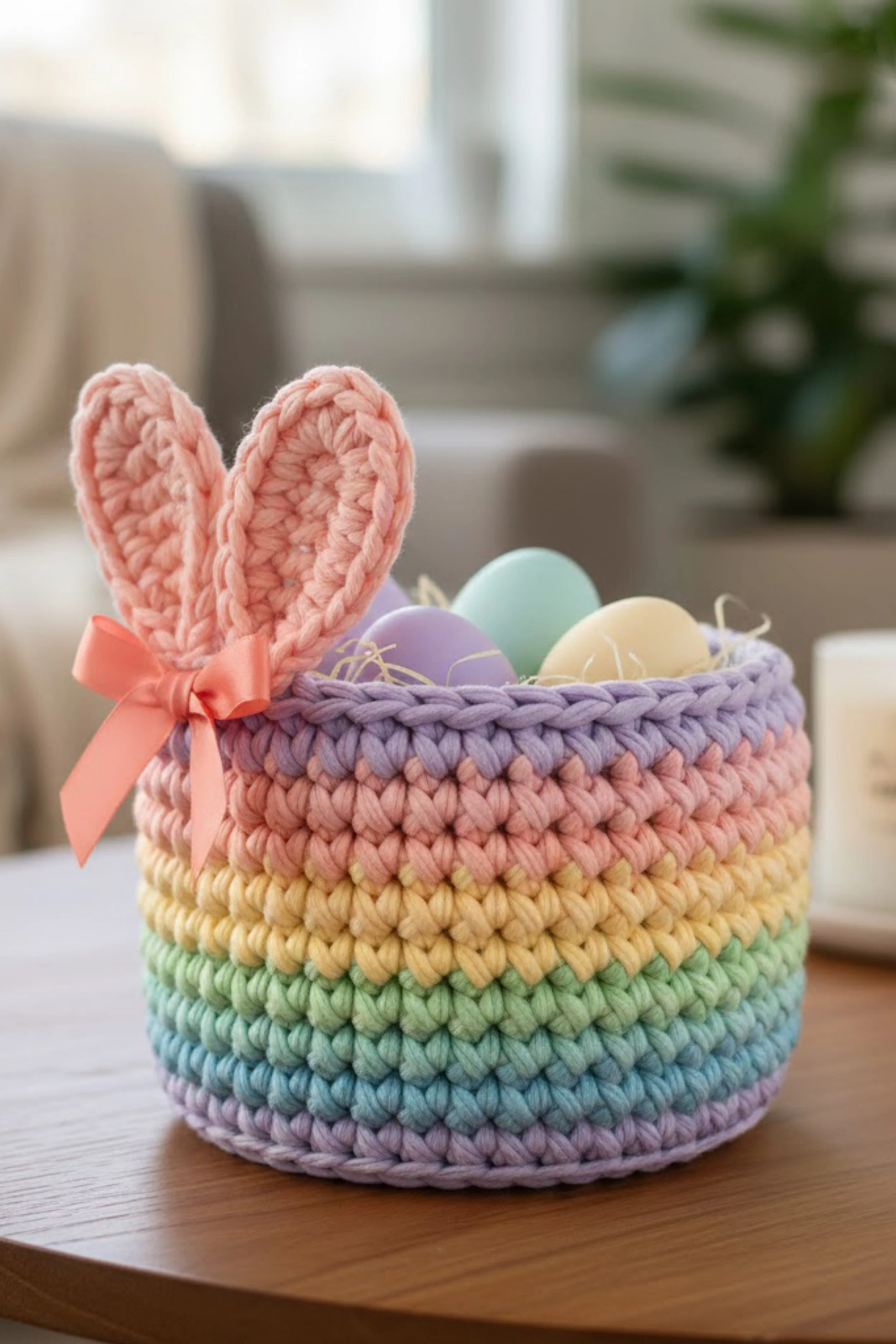 This is a pastel rainbow crochet basket with chunky horizontal color stripes, a thick rim, and tall bunny ears tied off with a coral ribbon bow. The overall silhouette is short, wide, and cozy, with a dense stitch texture that looks plush and modern. The colors read like soft spring candy: lavender, mint, butter yellow, peach, and light blue, stacked in smooth bands that make the basket look like a little rainbow bowl.