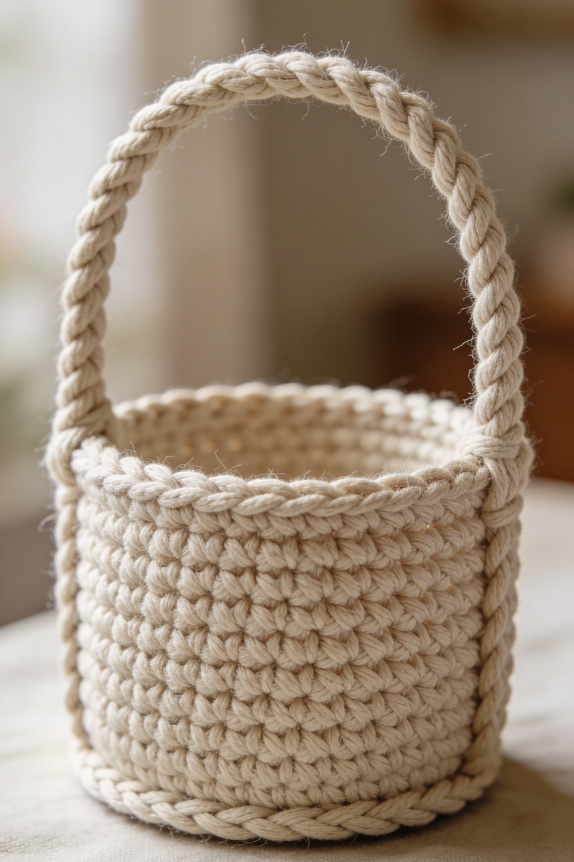 This is a clean, minimalist rope style crochet basket with a smooth, dense stitch texture and a thick braided handle that arches from side to side. The look is modern and neutral, with a subtle braided rim and a sturdy base that holds its shape on a tabletop. It reads like elevated storage, perfect for keys, skincare, remotes, or a little Easter refresh without screaming seasonal.