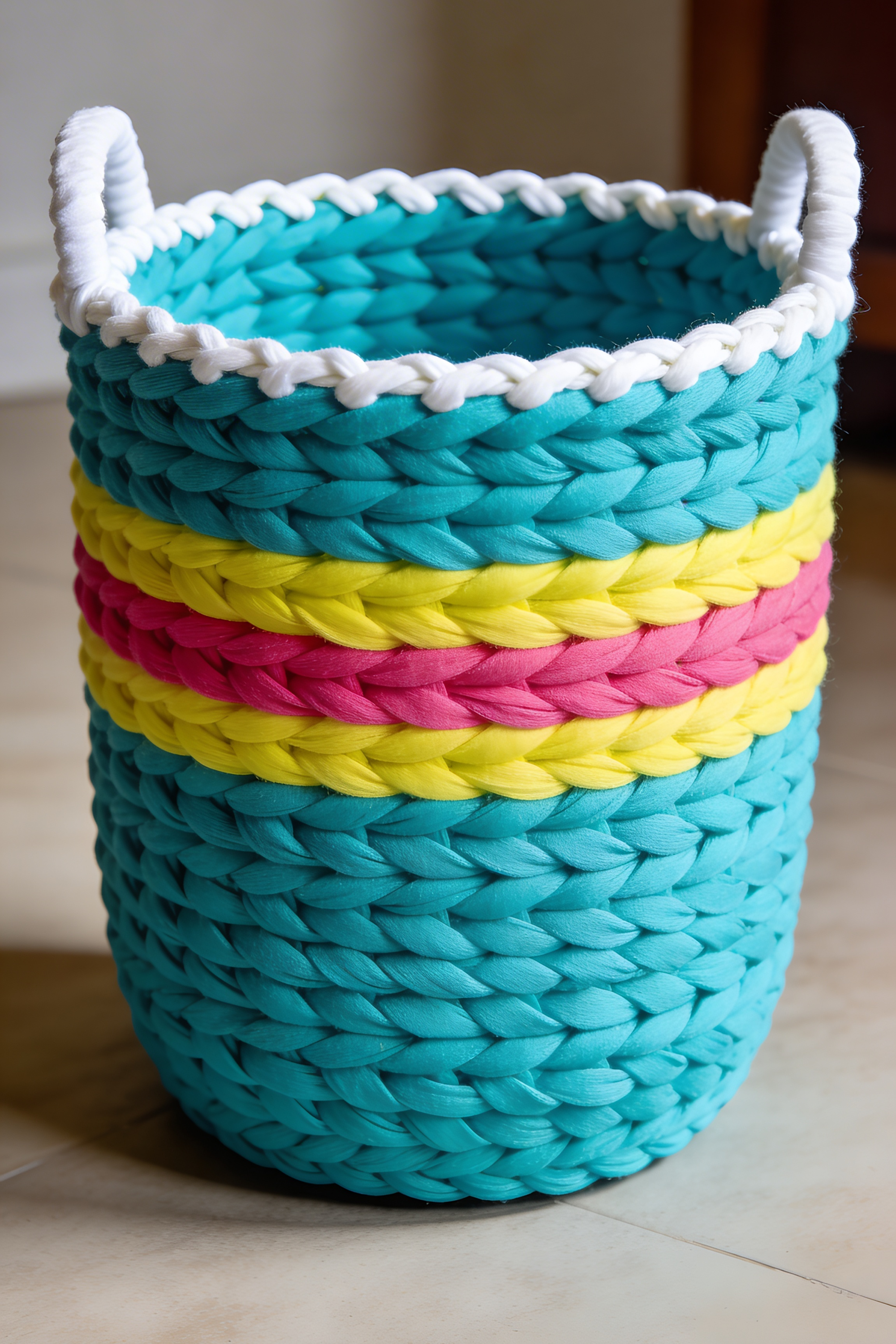 This is a tall, structured crochet basket with bold, graphic stripes and small side handles that curve upward like a soft tote. The stitch texture is extra chunky and braided looking, creating thick horizontal ridges that make the basket feel substantial and modern. The color story is playful and bright: turquoise, lemon yellow, and a hot pink stripe, topped with a crisp white rim that frames the opening.