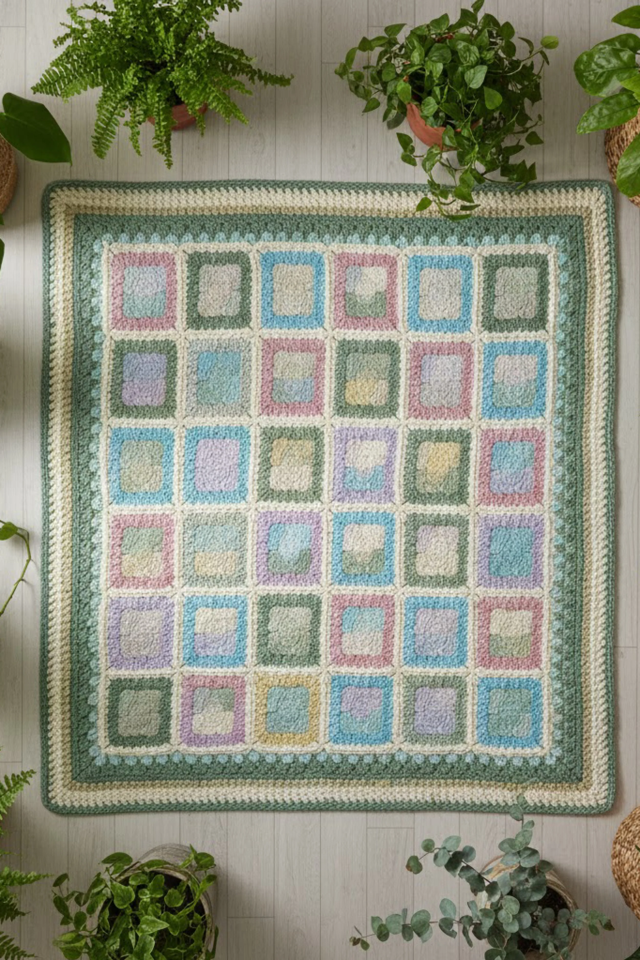 This is a pastel patchwork granny square rug or floor blanket, built from soft, rounded center squares in alternating spring shades, then framed with a wide, structured border in sage green and cream. The squares look plush and slightly textured, giving the finished piece a cozy, cushiony vibe that works perfectly in a plant filled room. The large border makes it feel finished and intentional, like a handmade statement rug.