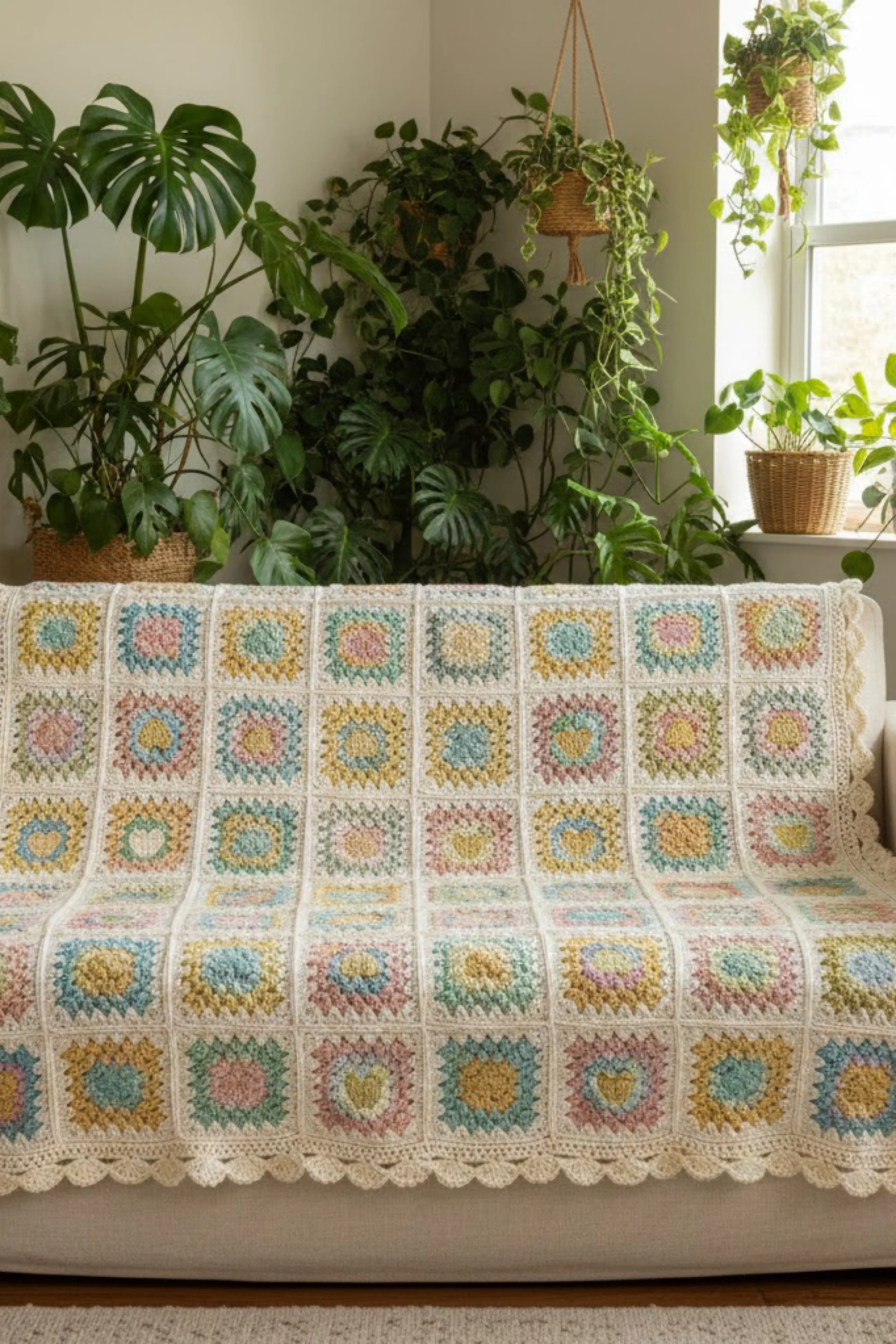 This is a cozy pastel granny square blanket made from repeating “sunburst heart” squares joined in clean rows, then finished with a soft, lacy scallop edging. The look is cottage sweet but still modern because the background stays creamy and consistent while the centers rotate through gentle Easter pastels. The finished throw drapes beautifully over a sofa and the squares stay crisp and graphic after blocking.