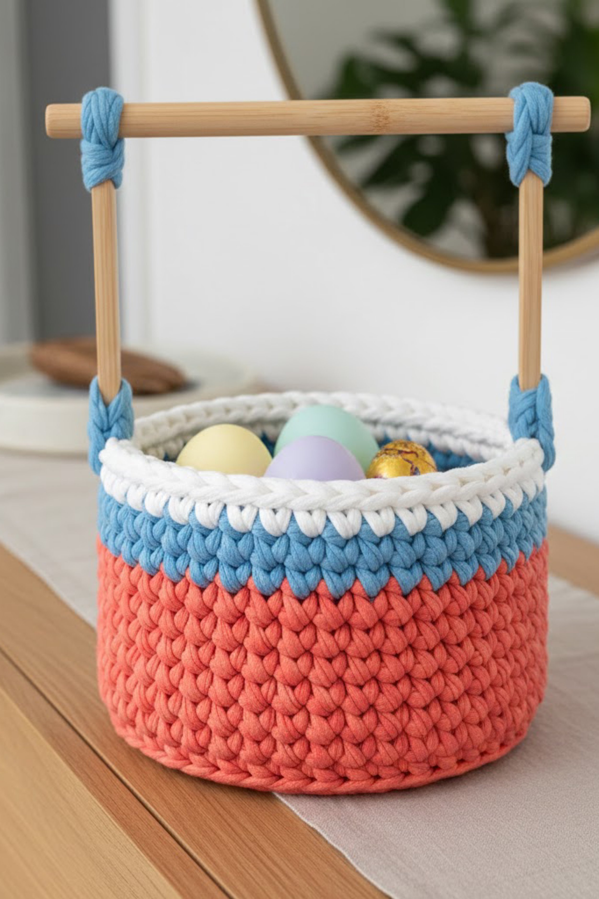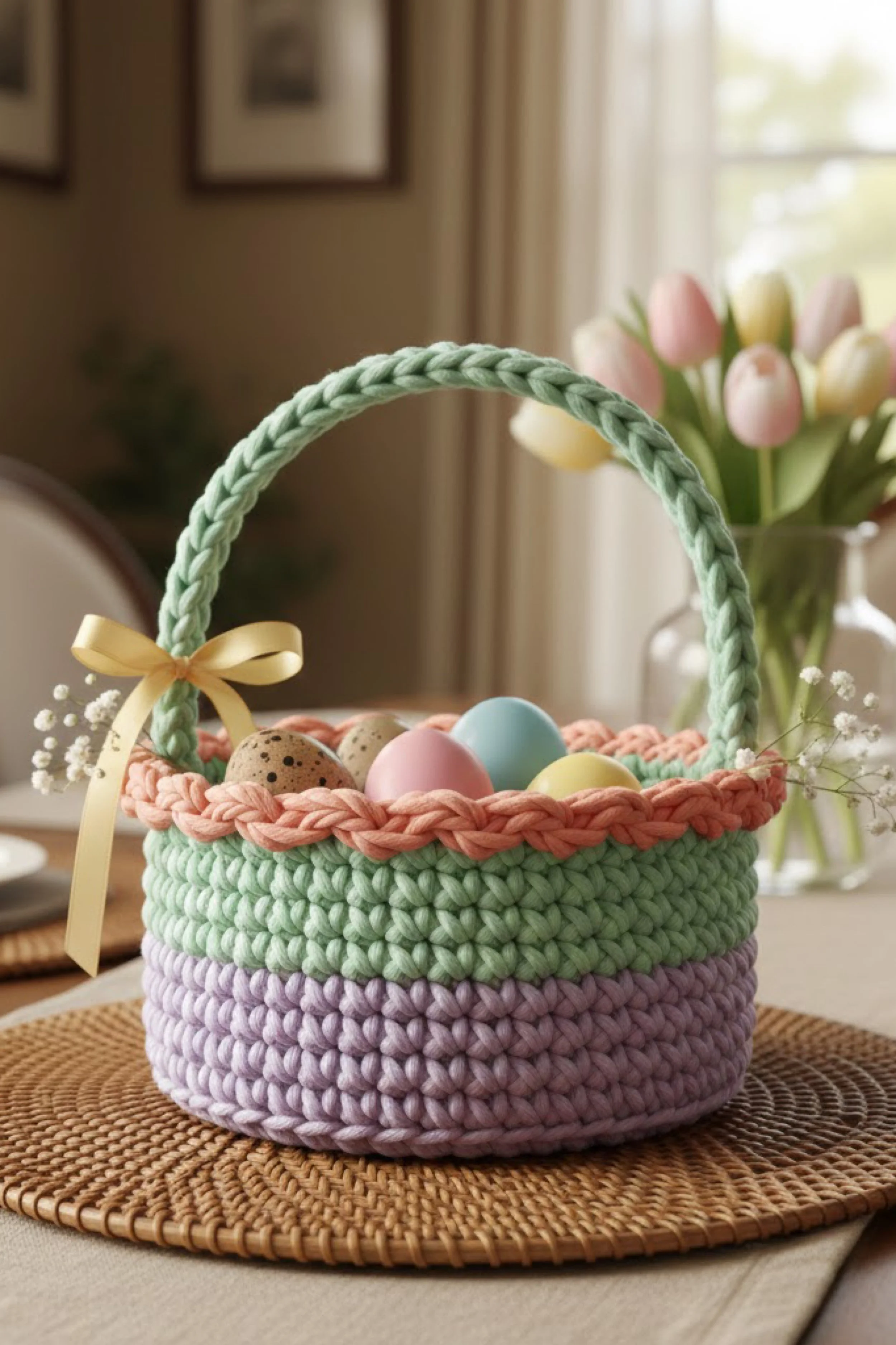 Weave in ends securely and trim close. Shape the basket by pressing the base flat and smoothing the walls. If the rim needs extra firmness, run a hidden strand of cord inside the top round and stitch over it like a core. For styling like the photo, fill with pastel eggs and keep the background clean and bright so the color blocks pop.