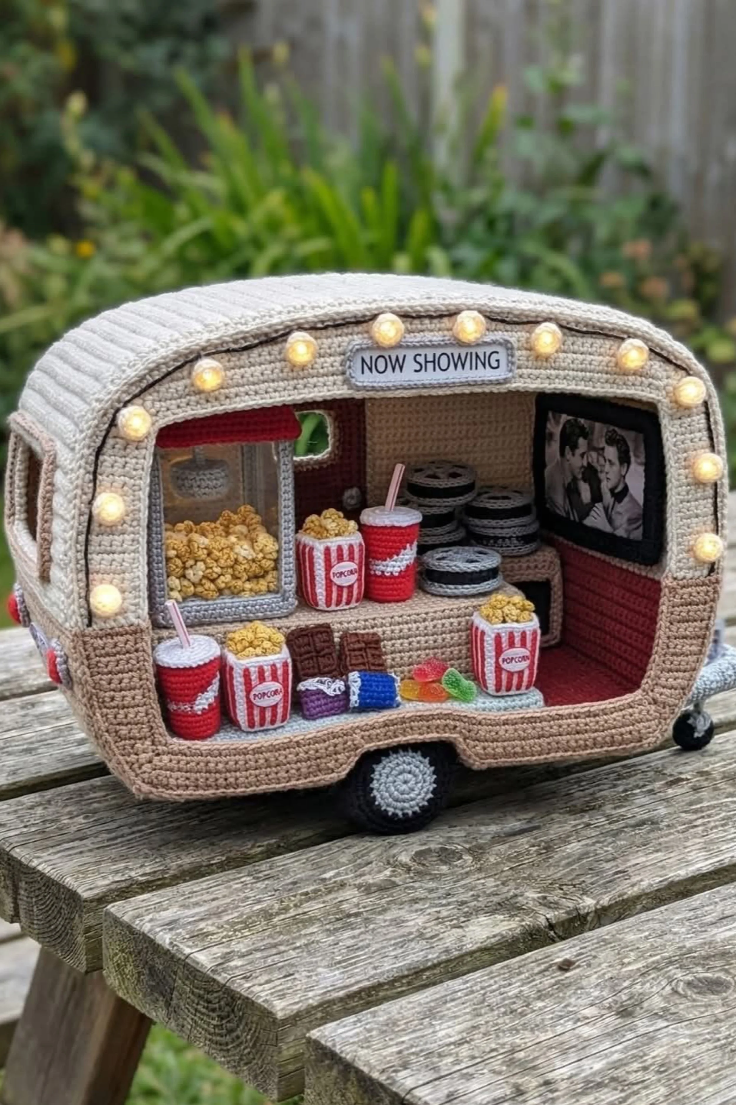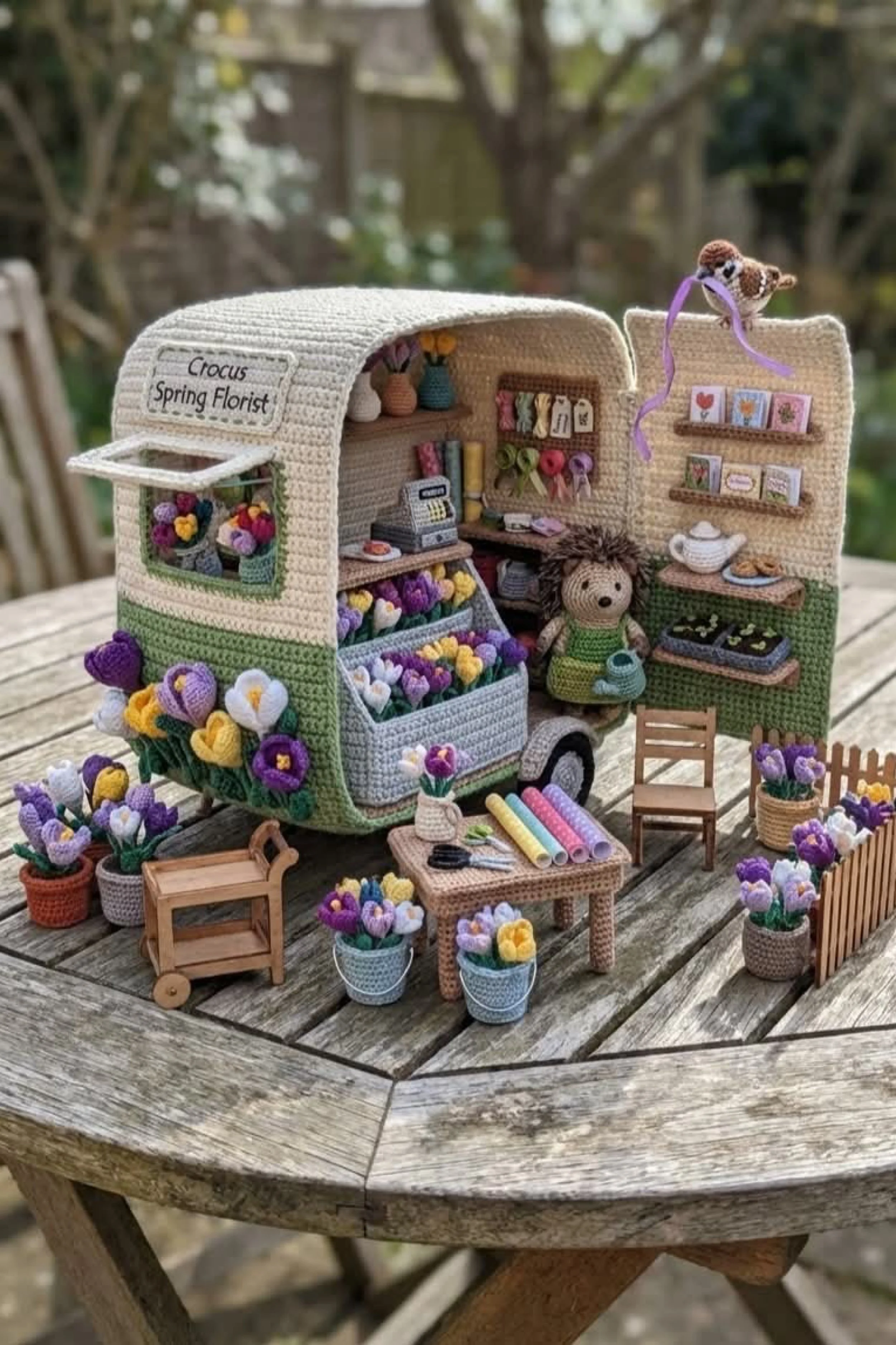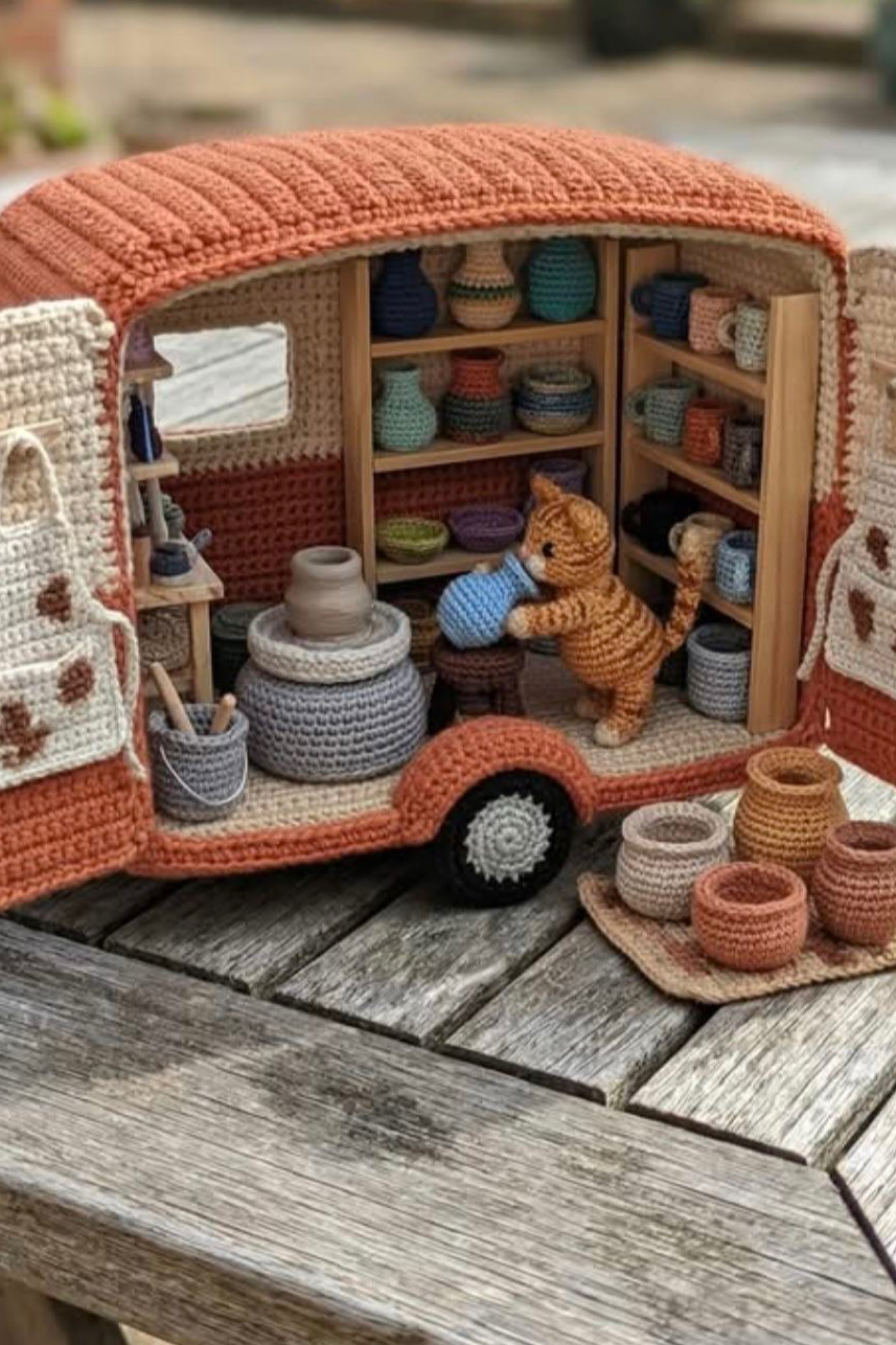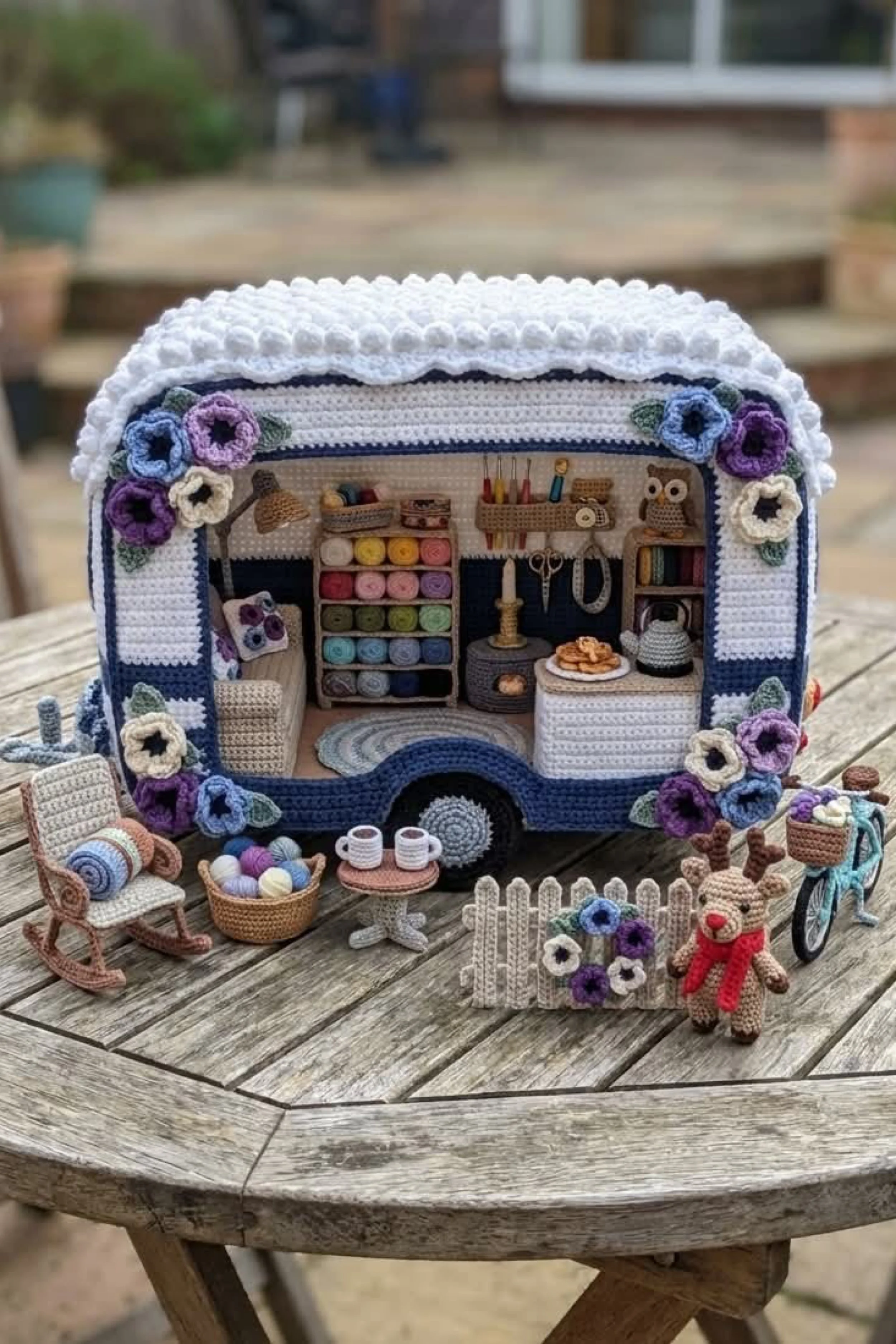 You’re crocheting a miniature open side camper trailer that looks like a tiny rolling craft studio, complete with striped interior walls, a bobble textured roof, floral corner garlands, and a fully styled outdoor scene. The finished look is cozy and storybook with miniature shelves of yarn, a workbench, teeny tools, and sweet accessories that make the whole scene feel alive. It’s the kind of display piece that stops people mid scroll because every inch has something charming to discover.