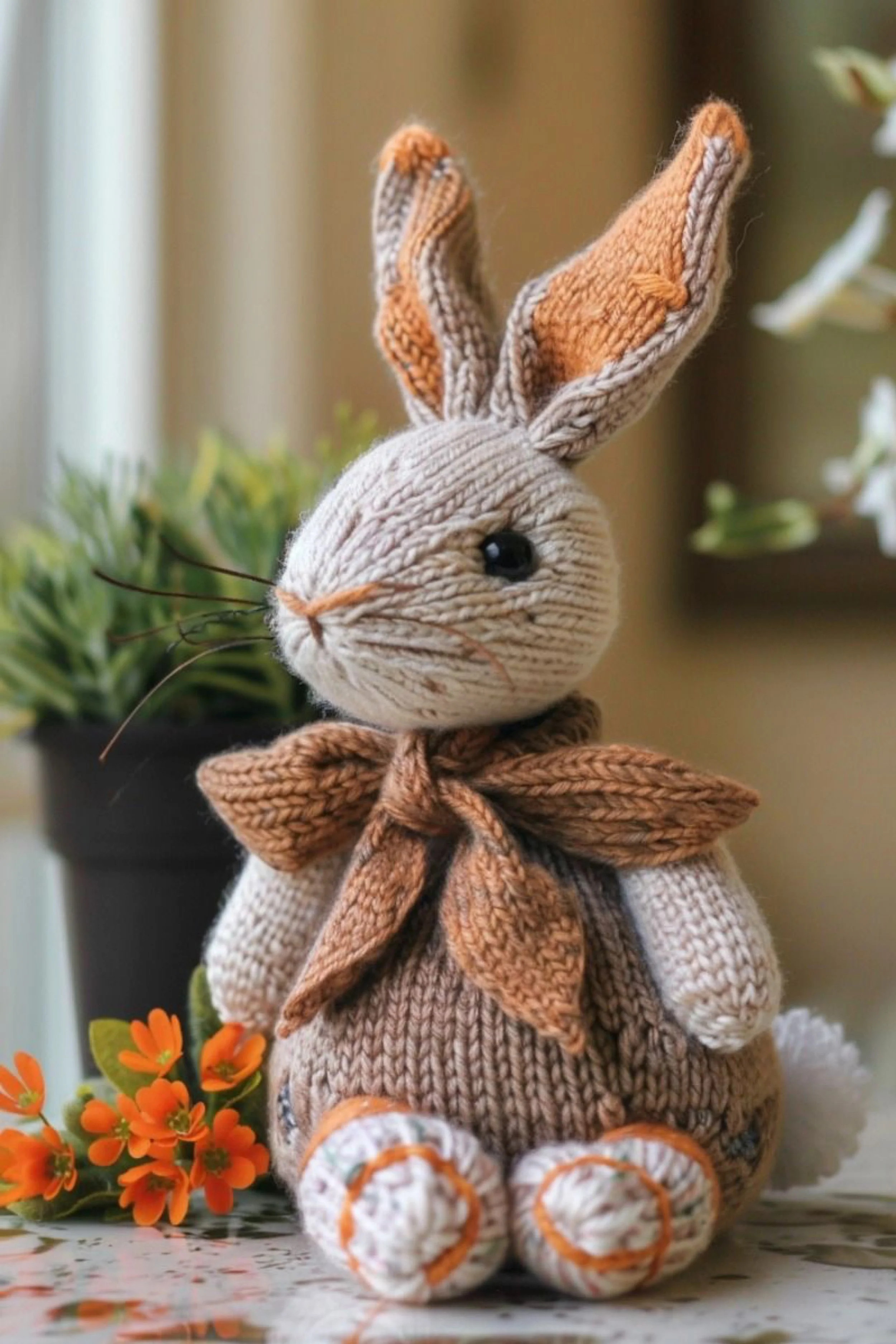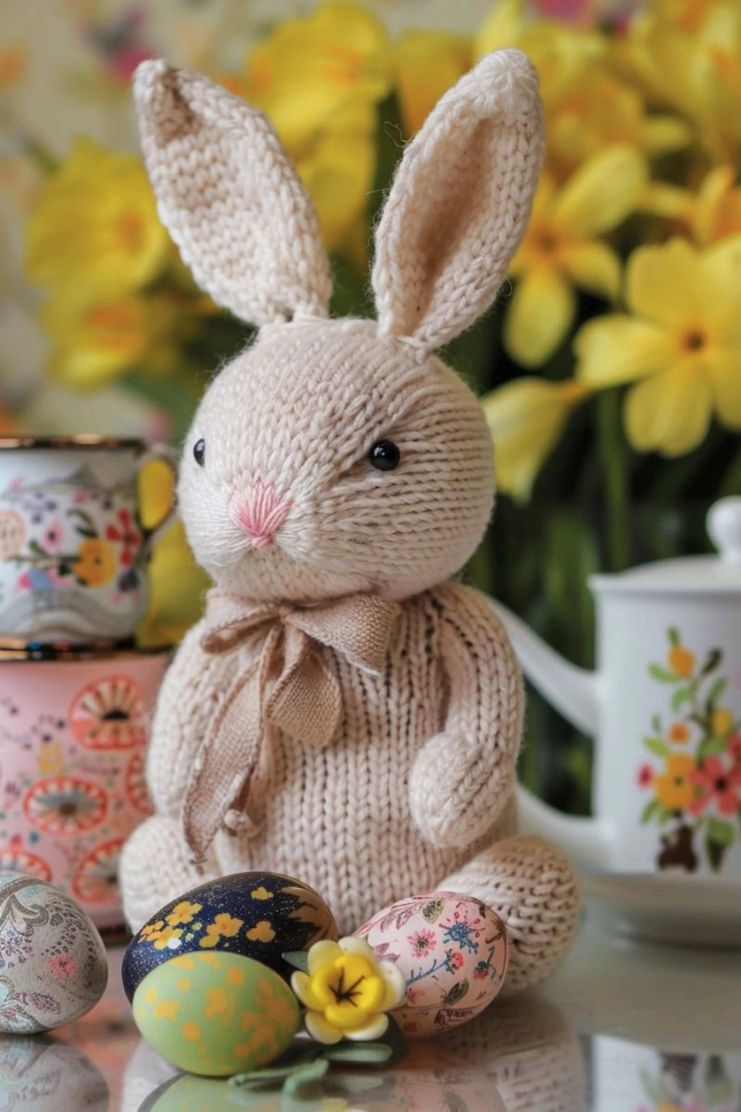 For styling, keep it simple and springy: a cluster of painted eggs, a bud vase of daffodils, a floral teacup, or one pretty bloom tucked beside your bunny makes the whole scene feel curated. And if you are gifting, add a soft ribbon tag and a little note about the yarn and date, it turns a sweet toy into an heirloom. However you use them, these knit bunnies are the kind of handmade decor that comes out every spring and never stops feeling special.
