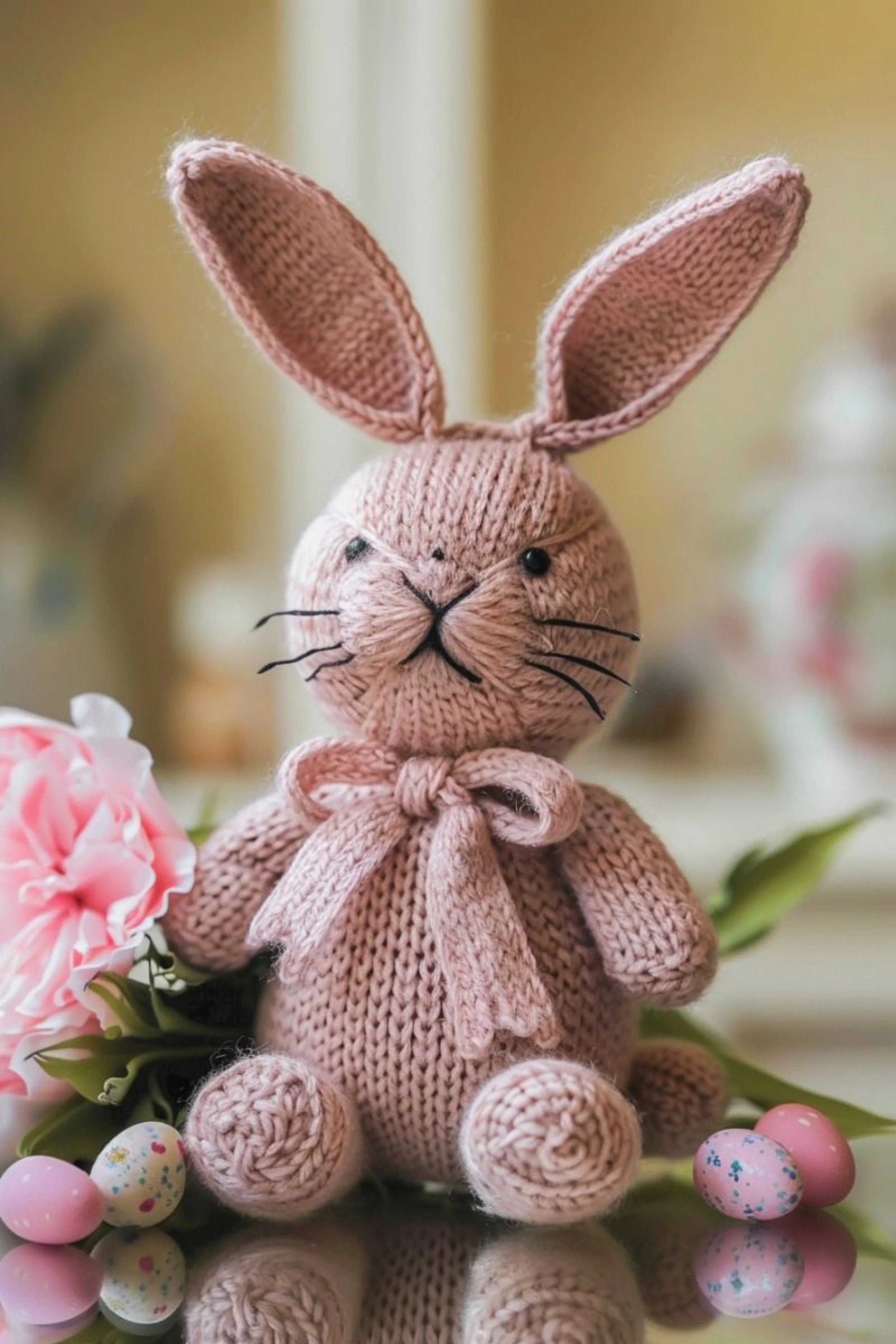 Weave ends inside the body and knot securely. Steam lightly from a distance if the stockinette needs smoothing. For the most photo ready finish, fluff the bow, adjust whiskers evenly, and pose the bunny with pastel eggs and one large bloom tucked to the side.