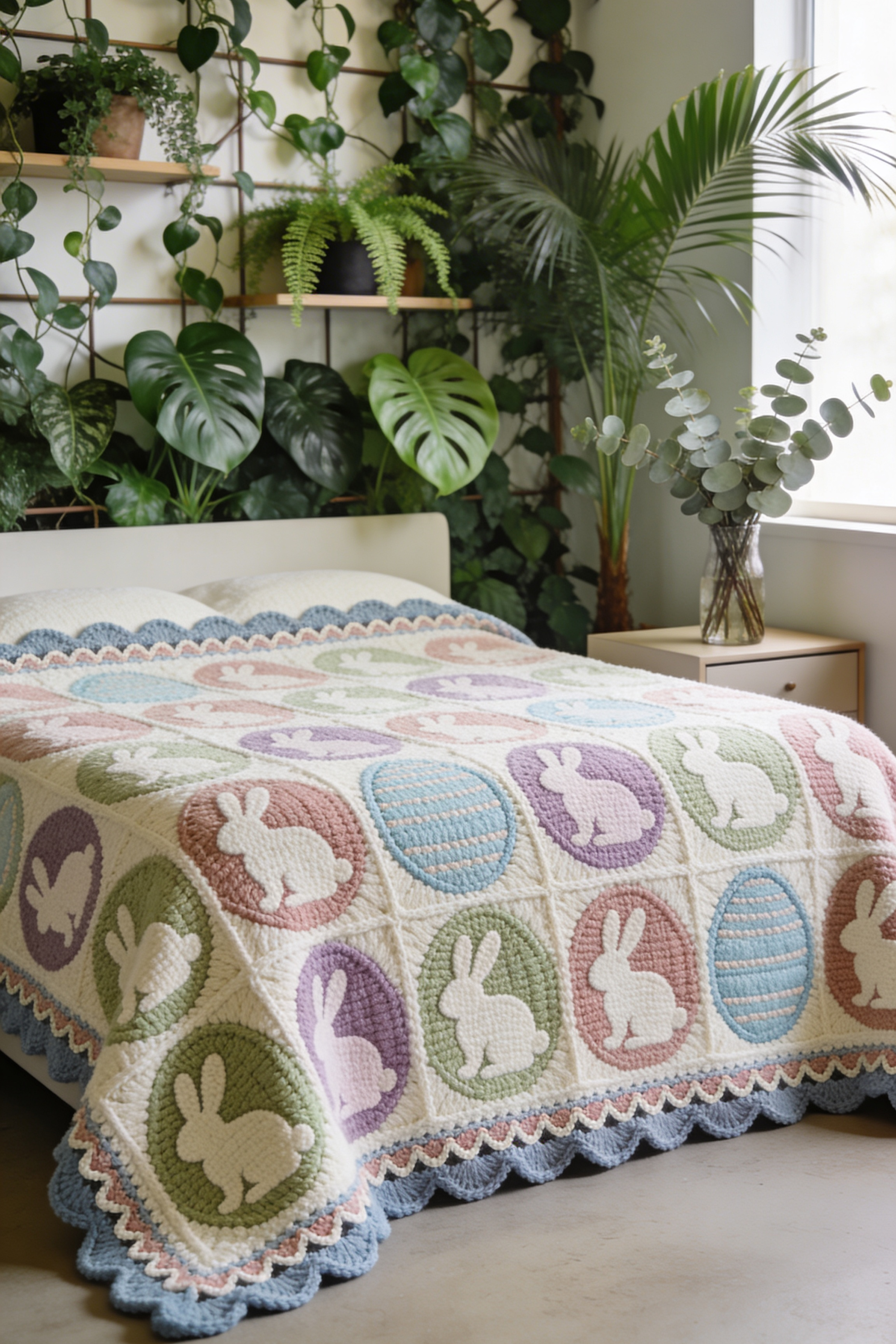 In the five tutorials ahead, you will recreate the exact vibes you see in the photos. A garden tile throw with tulip embroidery and a scalloped edge. A sunlit ripple blanket with perfectly even waves and a thin accent border that makes it feel finished, not homemade in the best way. A bold bunny and egg patchwork that reads instantly Easter but still looks elevated on a bed. A plush 3D flower granny square blanket that feels like a bouquet you can actually snuggle. And a simple, graphic egg block quilt that works as a play mat, wall quilt, or spring floor piece.