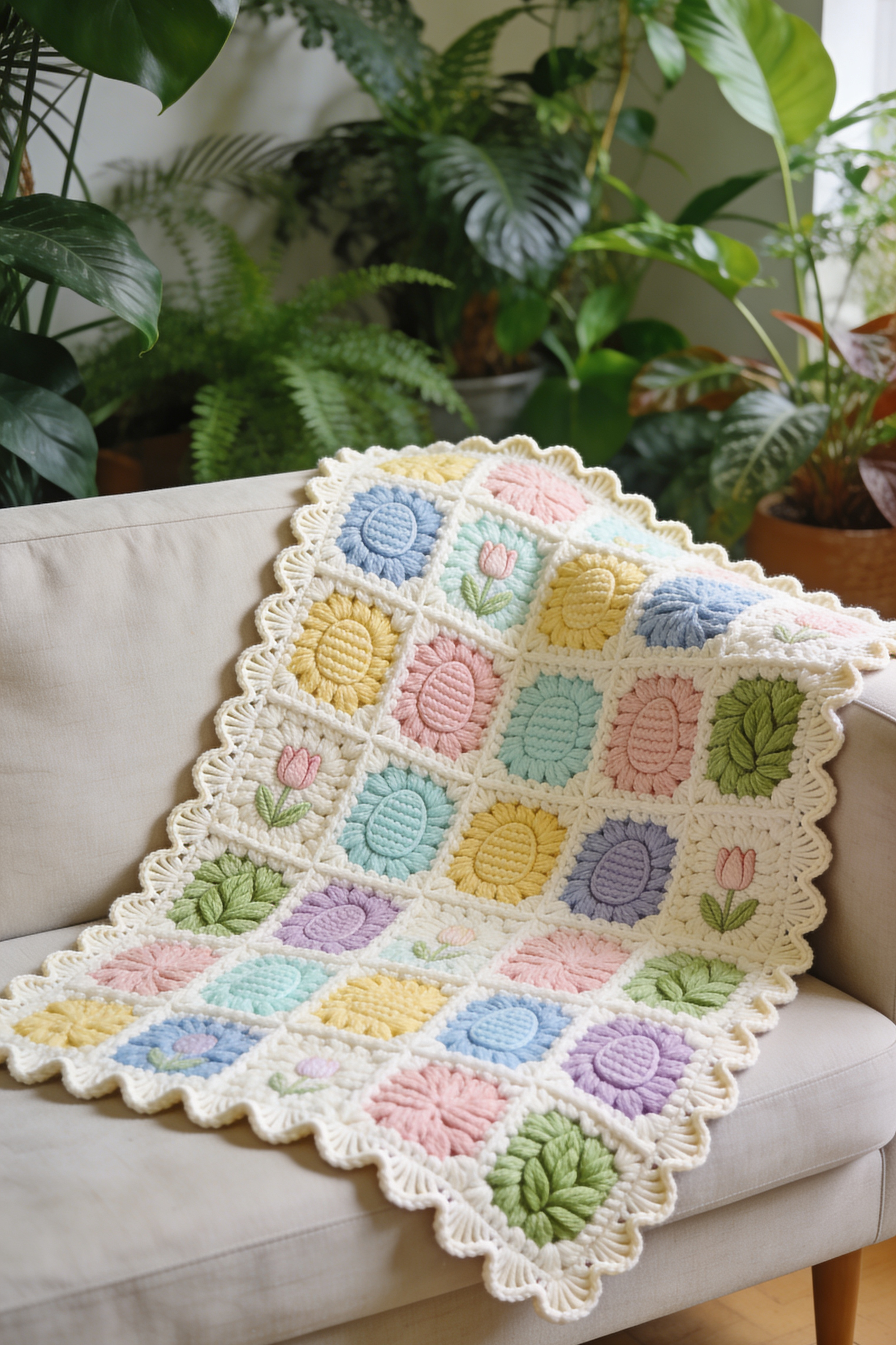This project recreates the sweet, heirloom look of the photo: a pastel patchwork throw built from textured granny squares featuring sunburst daisies and tiny embroidered tulips, all joined with creamy joins and finished with a soft scalloped border. It reads like springtime on a sofa, with gentle color blocks, raised flower centers, and just enough vintage charm to feel collectible. You can make it as a baby blanket, stroller throw, or a full couch sized throw by changing the number of squares.