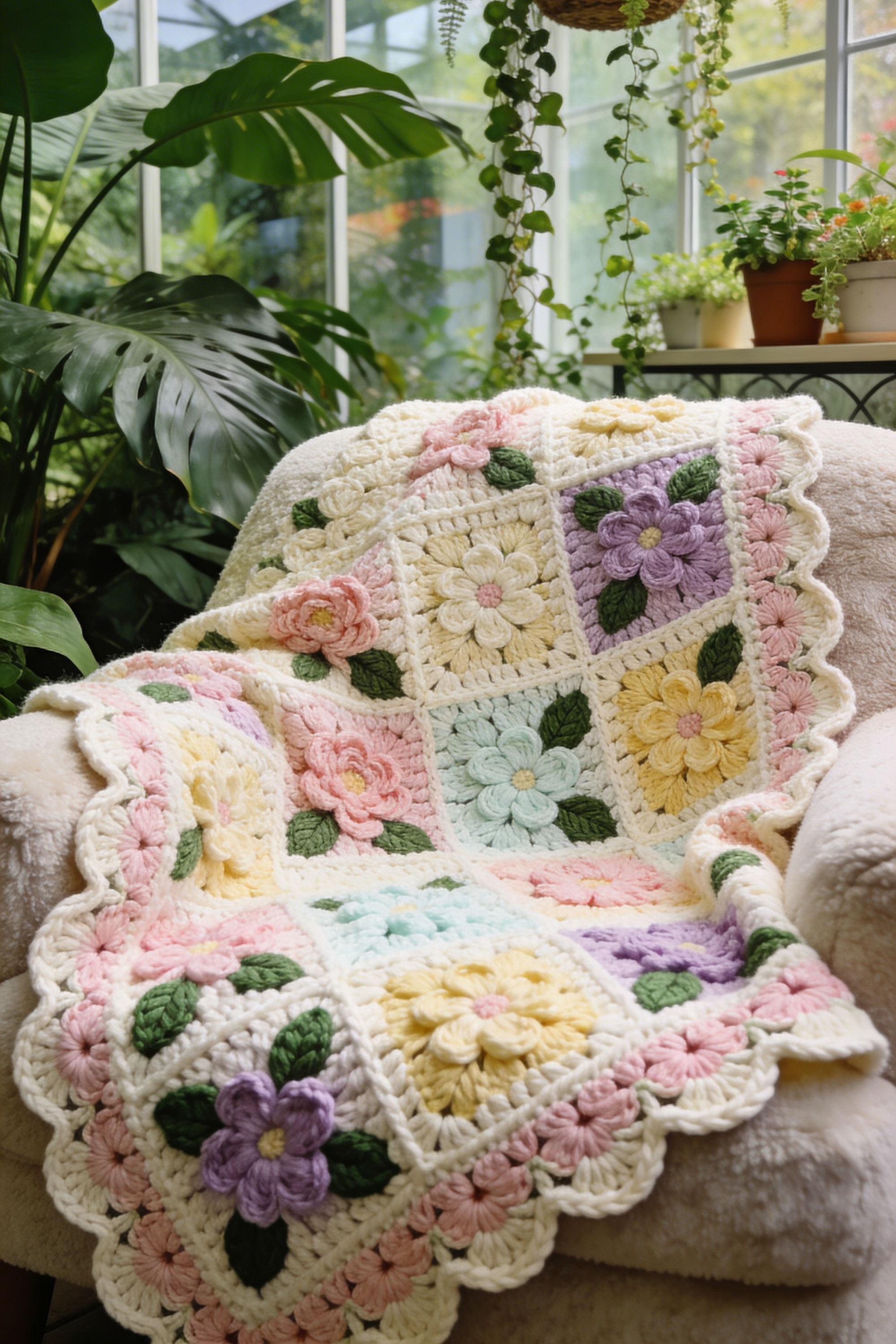 Pastel Garden Granny Square Throw Step-by-Step Tutorial — Tulips, Daisies, and Scalloped Edge