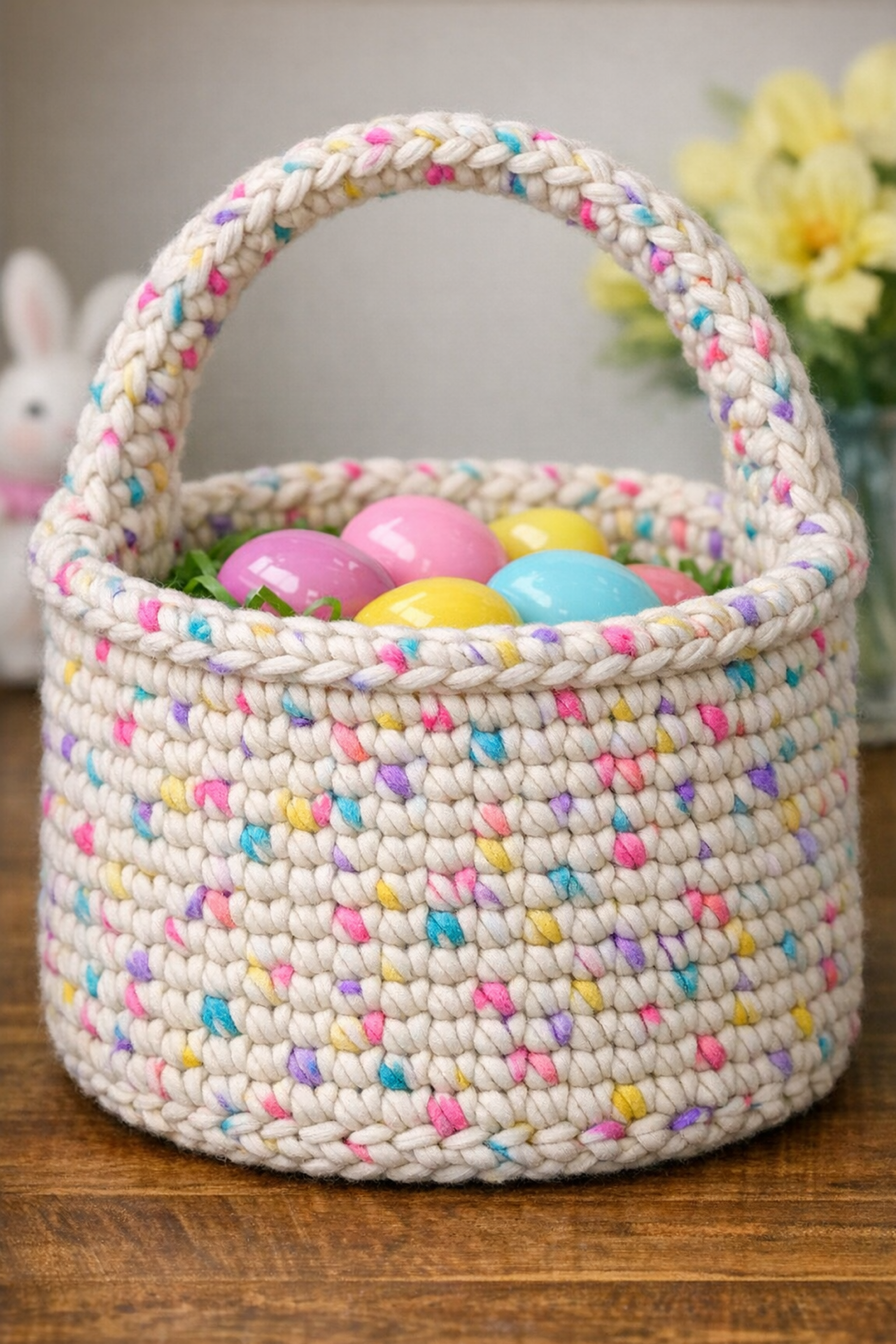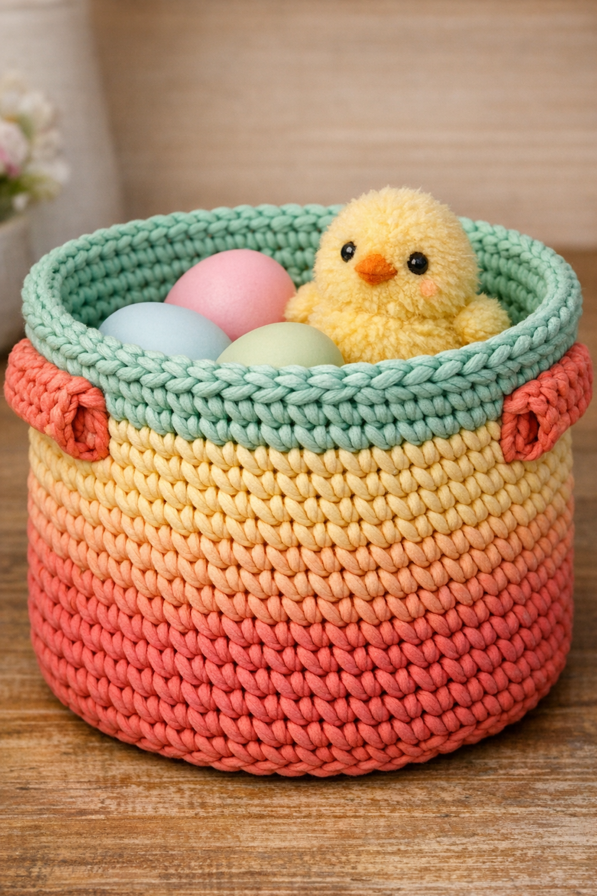 Once your basket is finished, style it like the photos with tissue paper, pastel eggs, and a little pop of greenery or a tiny plush detail. These baskets also make the sweetest reusable gift wrap, and they are cute enough to keep using long after Easter as catchalls for keys, craft supplies, or cozy shelf storage. Save your favorite pattern, make a second one in a new color palette, and build your own signature basket collection for spring.