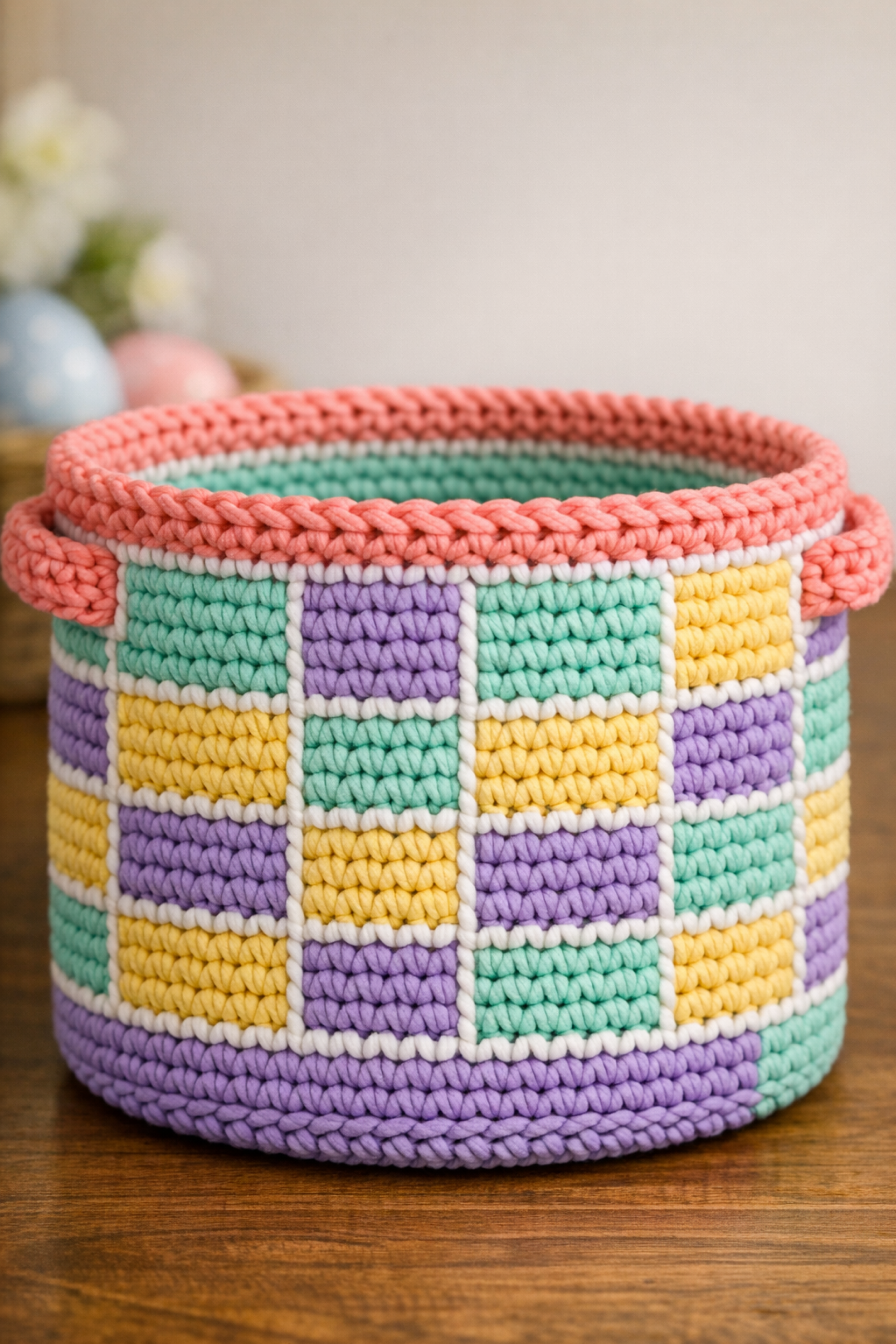 This is a structured pastel checkerboard crochet storage basket with tidy white outlines between color blocks and small side handles, just like the photo. The body looks like a grid of squares in lavender, mint, and butter yellow, framed by white lines that make the pattern pop. The rim is thick and coral, giving a clean, modern finish that still feels playful and spring ready.