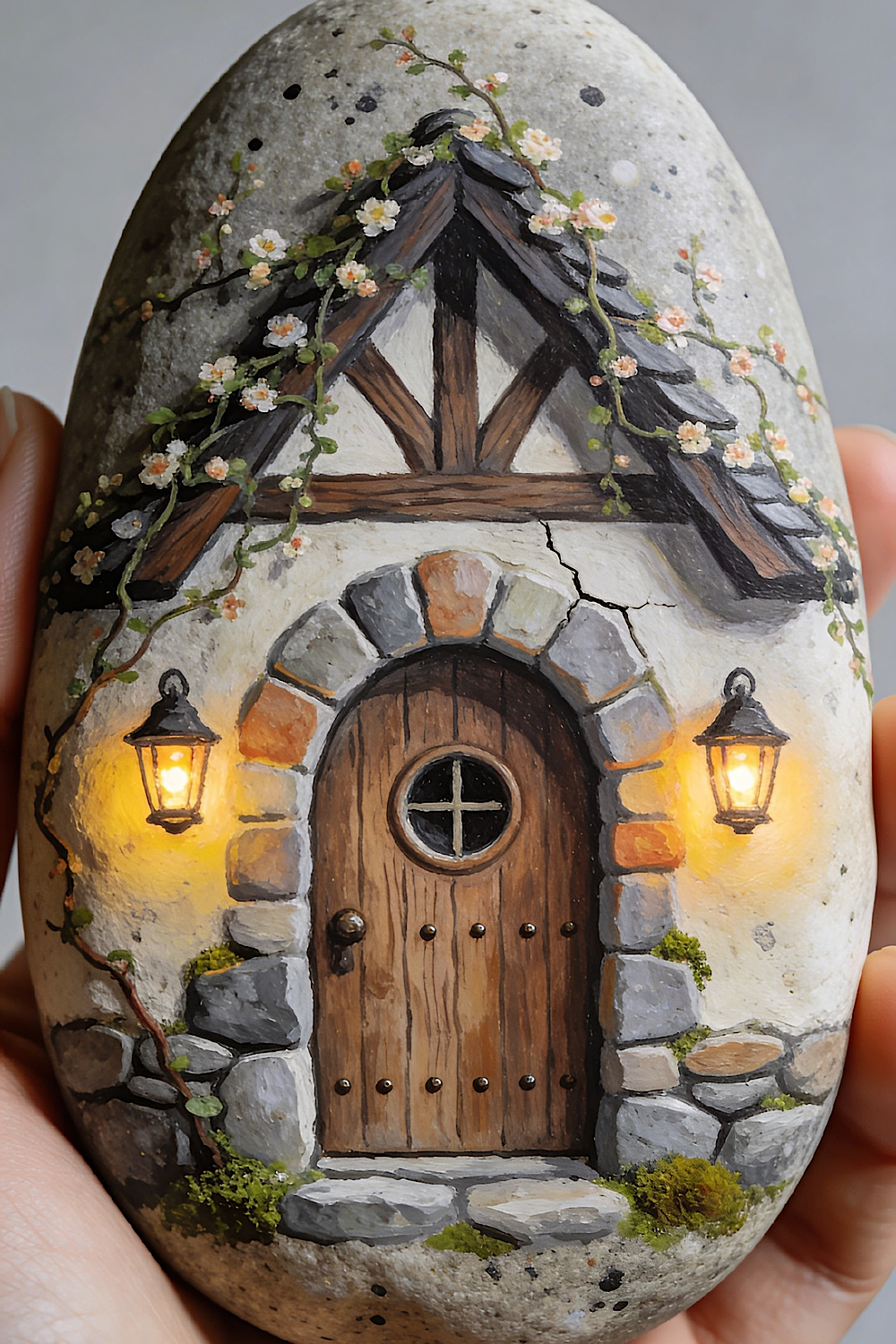 You are painting a cozy cottage doorway on a speckled stone, with a chunky stone arch, rustic roof framing, delicate flowering vines, and two lanterns that cast a warm golden glow. This design leans more dramatic and realistic than the pastel version, with stronger shadows, richer browns, and light that looks like it is actually shining on the wall. The result feels like a tiny enchanted entrance tucked into a hillside.