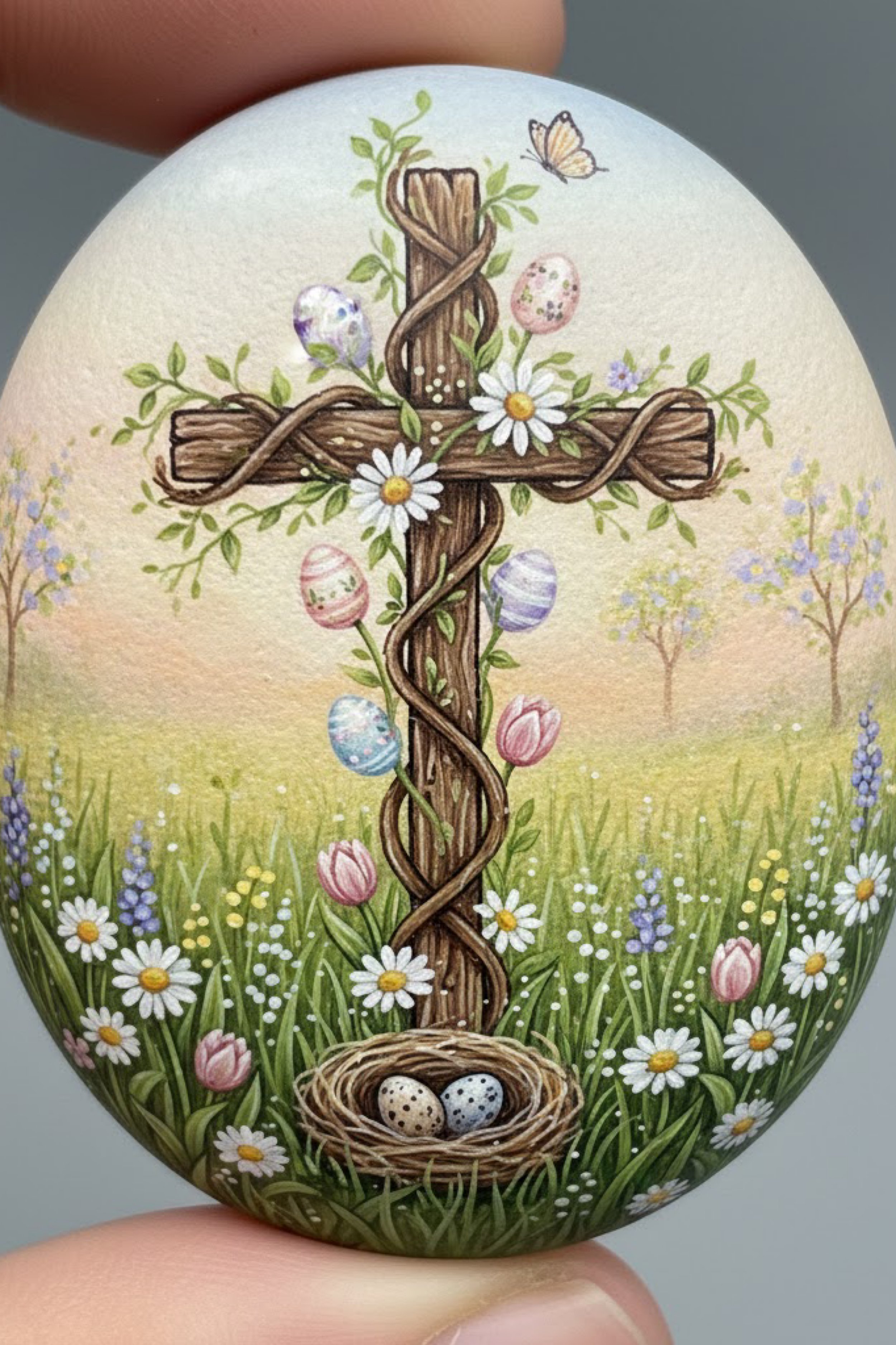 Paint the back a solid pastel with a tiny flower corner motif for a finished gift look. For display, place on a small easel or nestle into faux moss with pastel eggs and spring florals.