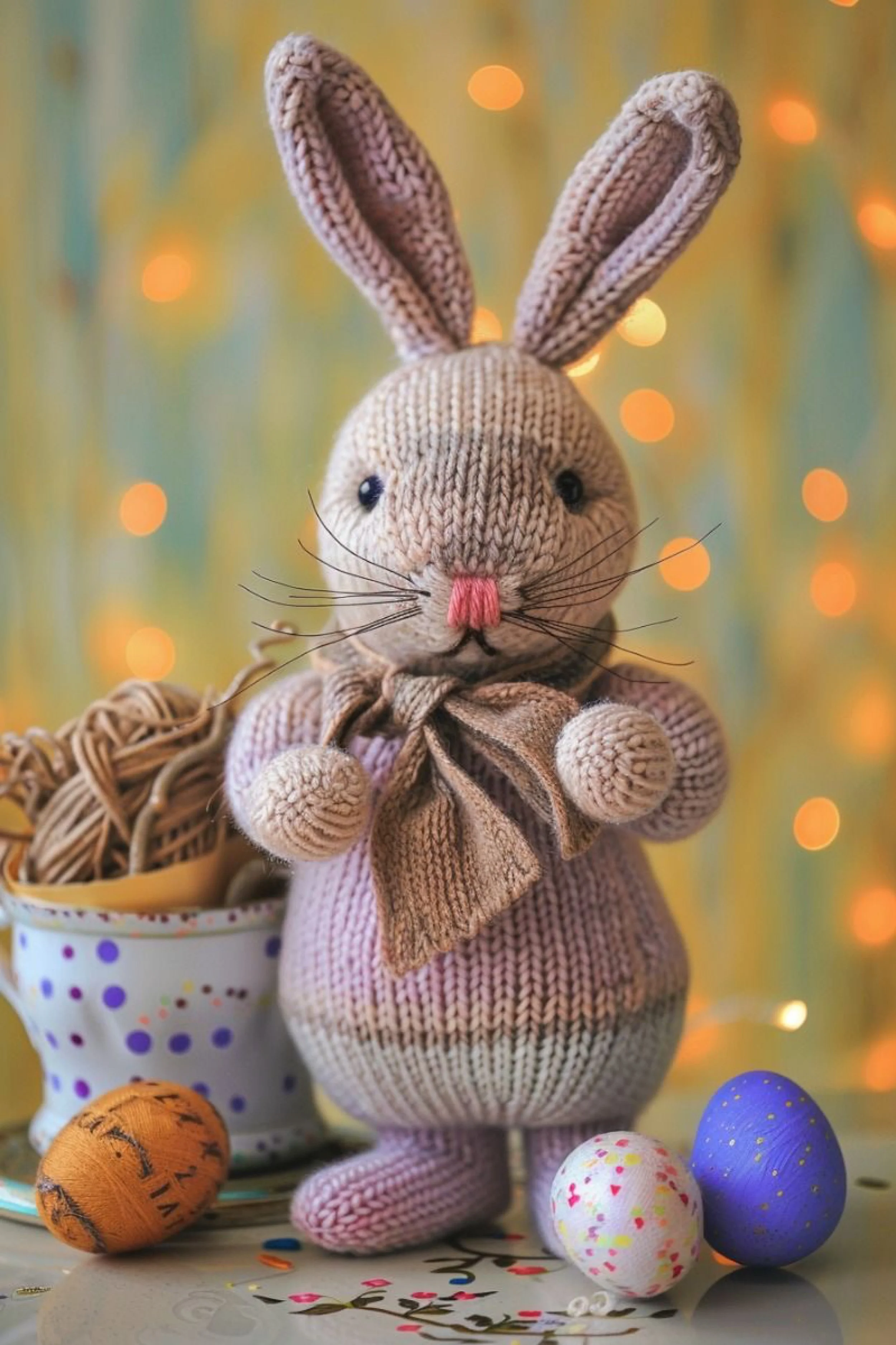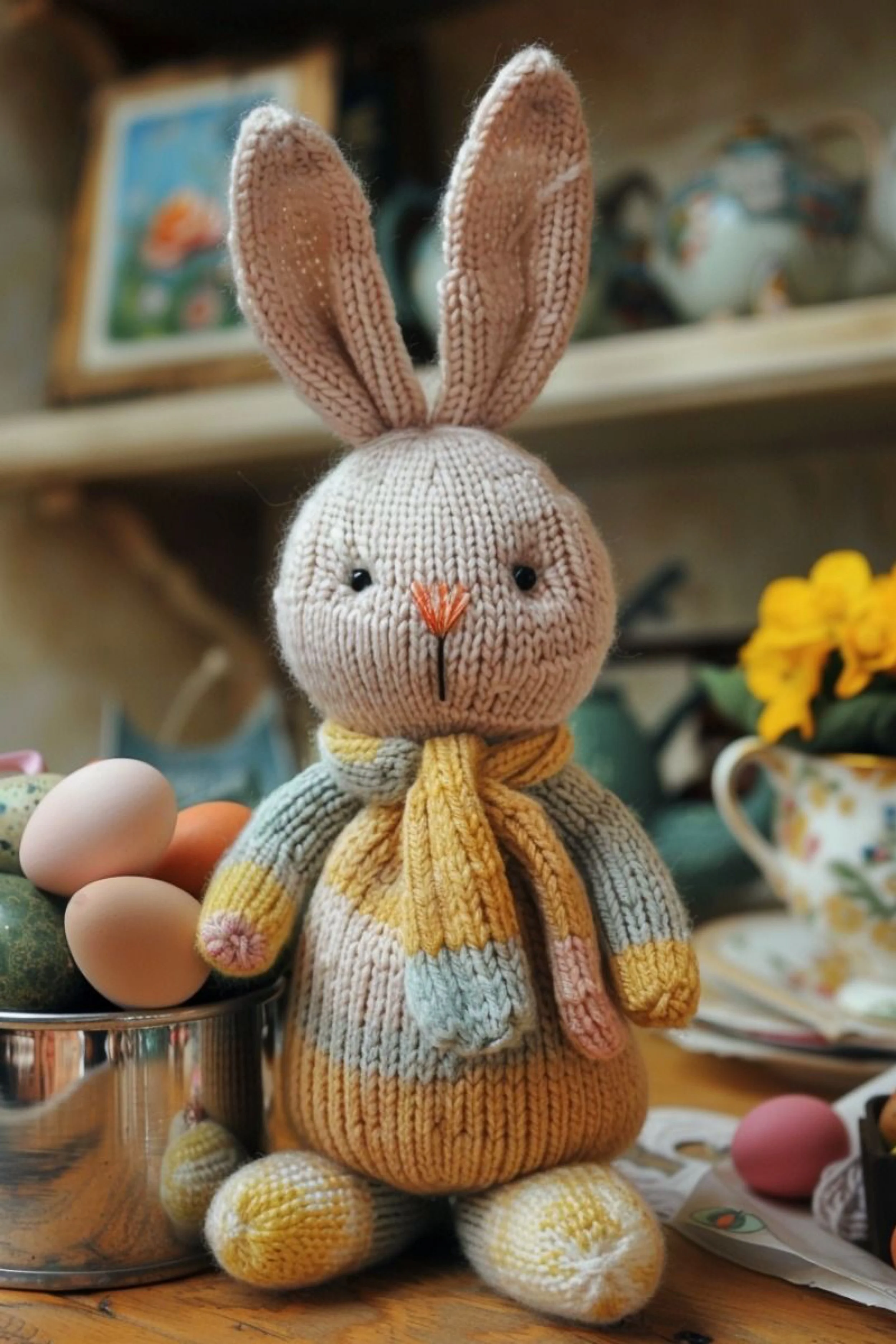 Final styling details. The photo gives warm, kitchen table, collected Easter morning energy. Set your bunny beside eggs in a bowl, floral china, or soft yellow flowers to really match that mood. The handmade scarf can become the bridge that connects the bunny to the rest of your decor palette.
