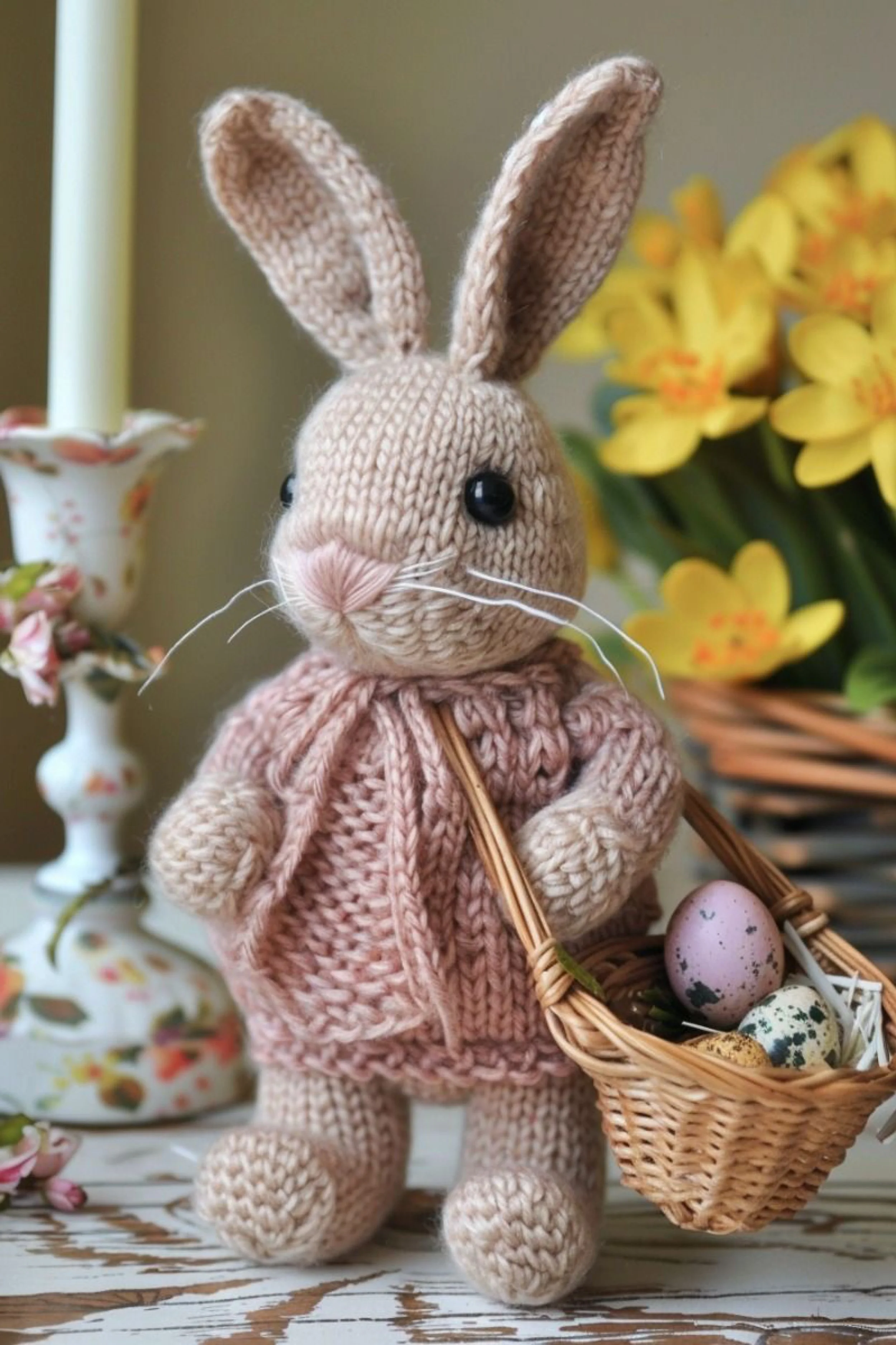 You’re making a standing knitted bunny dressed in a tiny blush cardigan and carrying a little basket of speckled eggs. This design has a sweeter storybook feel than the first bunny, with a lighter cream head, soft whiskers, and a dressed body that feels ready for spring shelf styling. The overall look is delicate, nursery pretty, and ideal for Easter centerpieces or a seasonal keepsake gift.