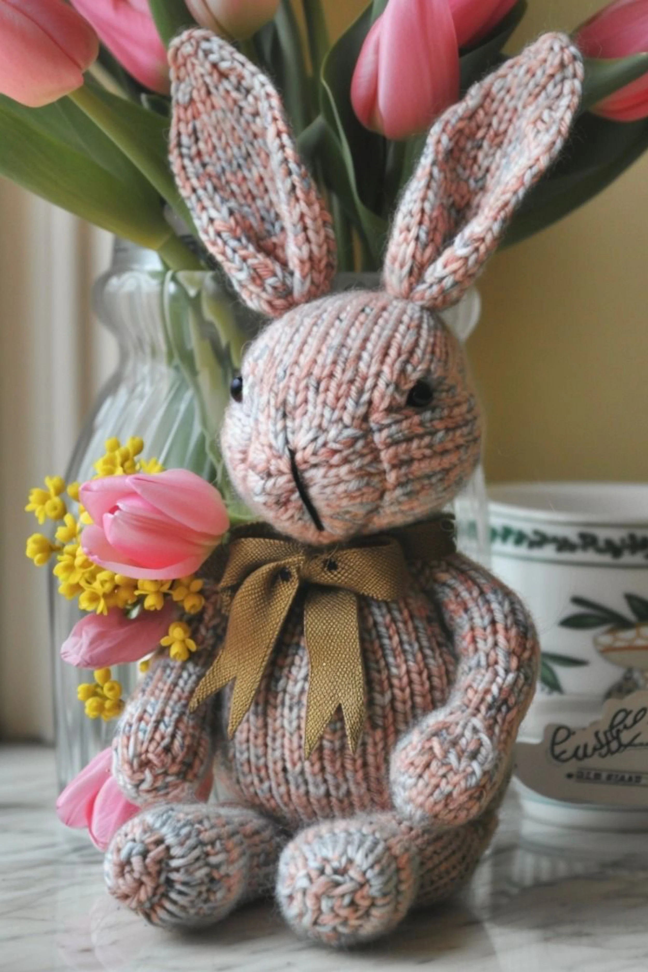 Final styling. Brush away loose fibers, smooth the ears, and place the bunny beside flowers to check the mood. The photo feels springlike, gentle, and collected. If your bunny looks too rustic, use a satin ribbon and cleaner embroidery. If it looks too formal, choose a slightly fuzzier yarn and a softer bow.