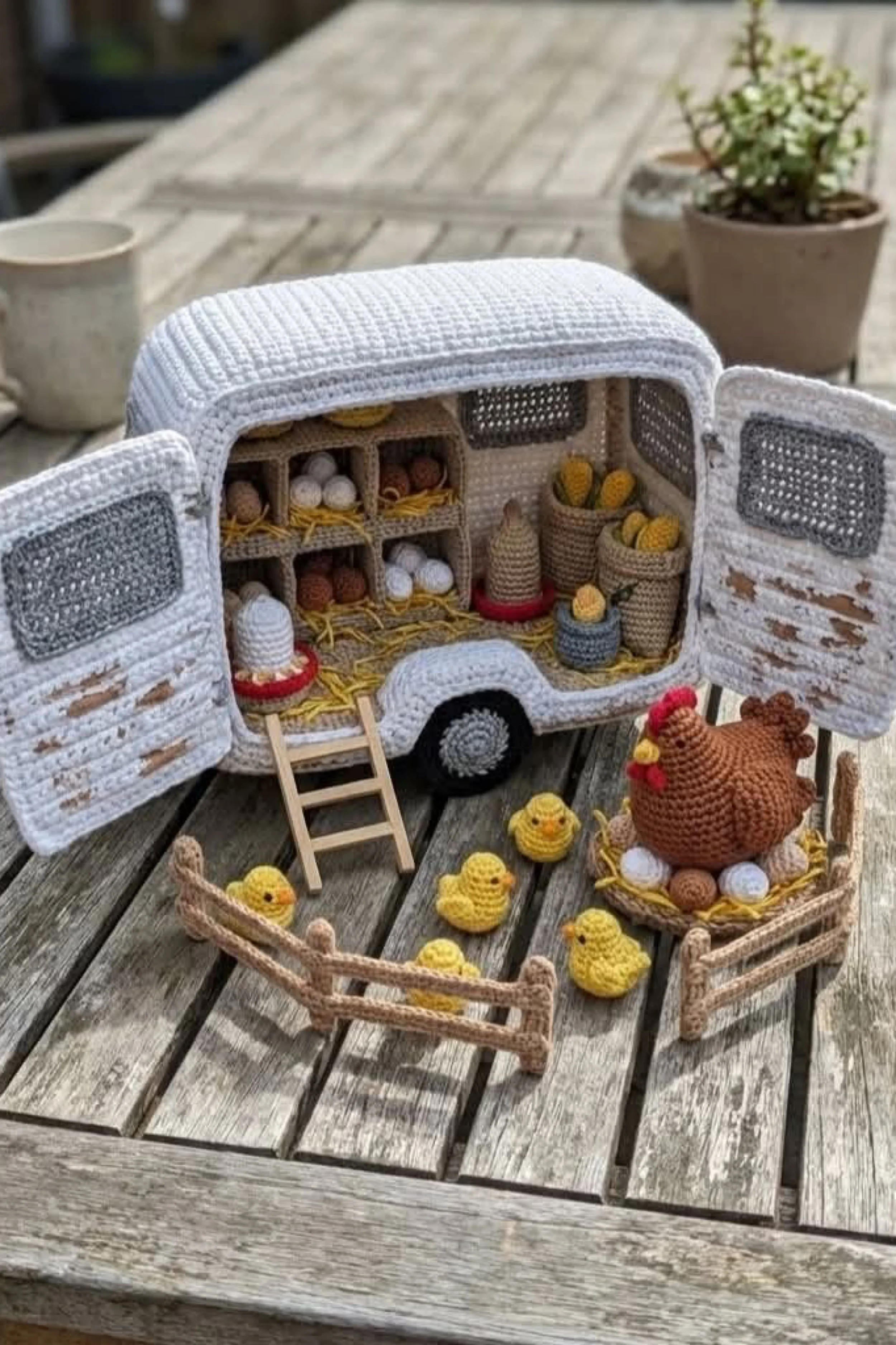 You’re making a whimsical crochet caravan that opens into a miniature hen house, complete with egg cubbies, tiny straw details, a ladder, little chicks, feeding bowls, and a proud mother hen sitting on her nest outside. The overall look feels storybook rustic, with soft farmhouse colors, a rounded vintage trailer shape, and just enough miniature structure to make it look like a real traveling chicken coop.