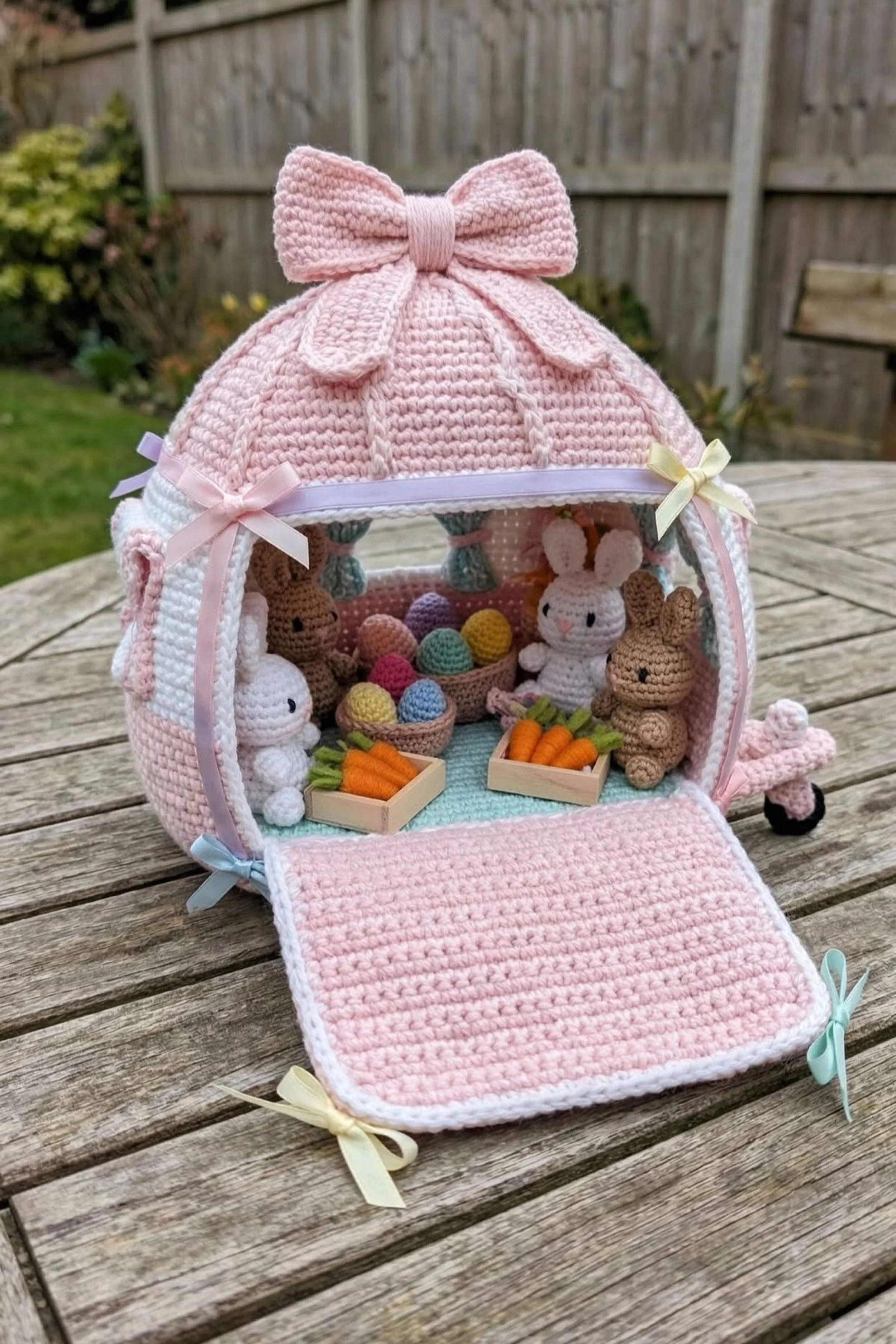 Before you crochet, study the silhouette. This caravan is almost egg shaped from the front, with a rounded upper shell, a large front opening, a fold down ramp panel, tiny side windows, a tow hitch, and a huge decorative bow on top. The inside is staged like a miniature bunny room with baskets, eggs, and crates.