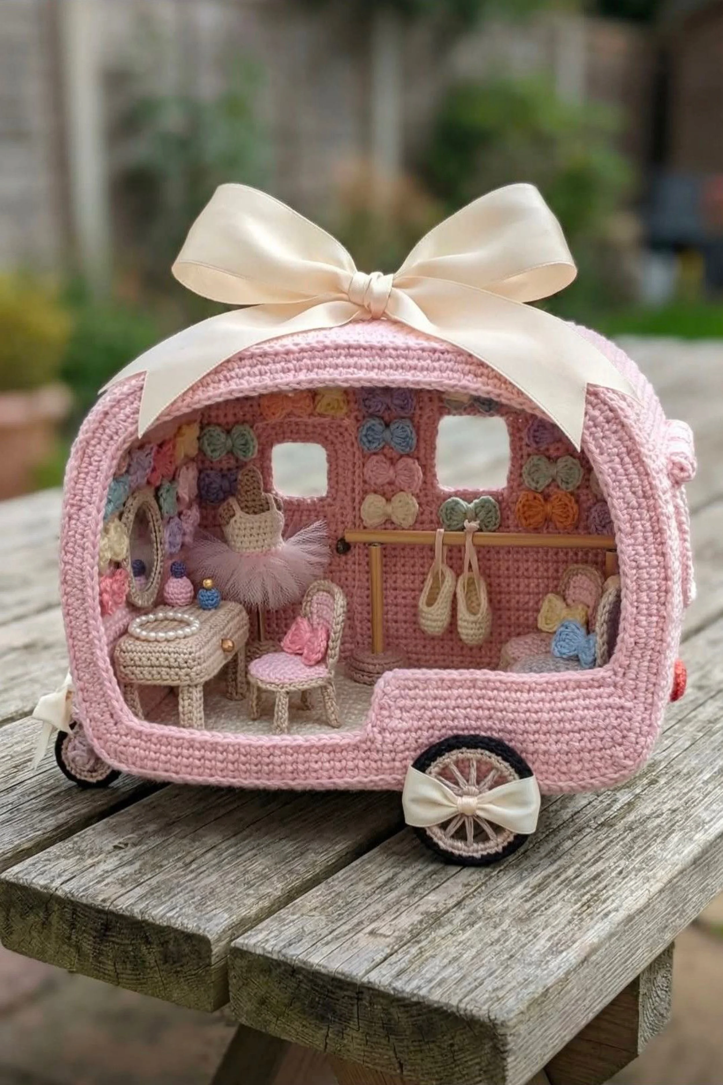 You’re making a pastel pink crochet caravan styled like a tiny ballerina boutique, with bows lining the walls, a miniature vanity, a tutu display, doll shoes, a clothing rail, and oversized satin bow details on the exterior. The finished piece feels sweet, delicate, and theatrical, like a little dressing room on wheels designed for a storybook dancer.