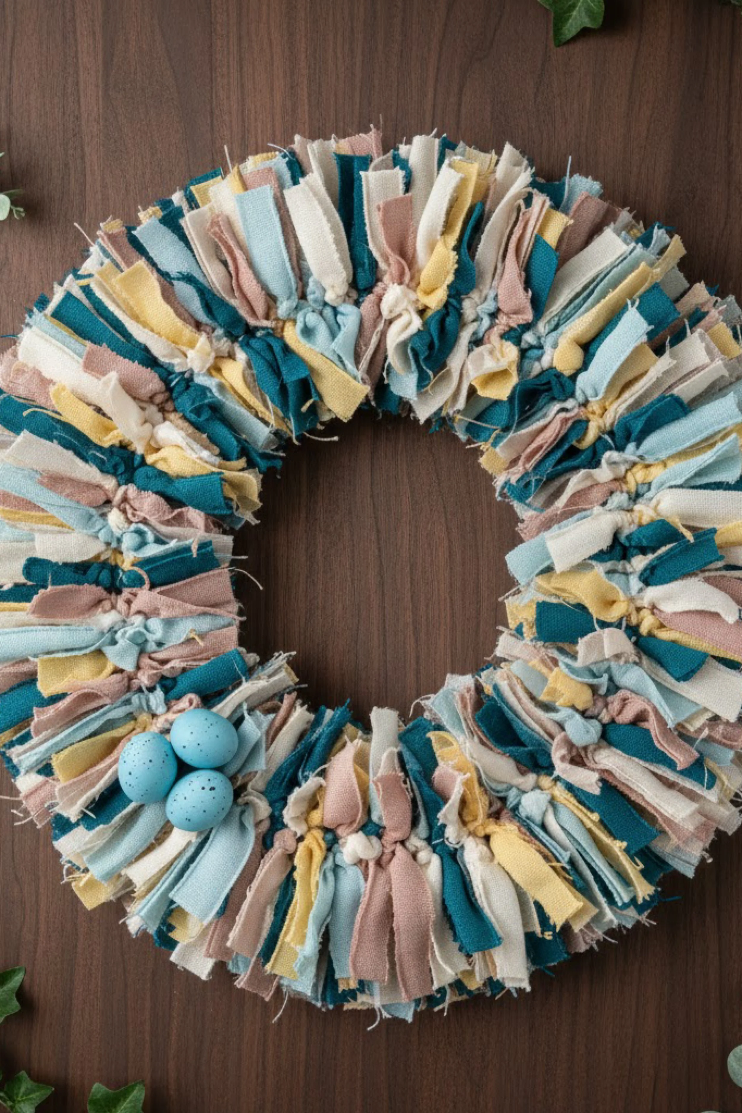 This project recreates a plush rag tie wreath that looks like a soft fabric cloud wrapped around a ring, finished with a tiny nest moment of speckled eggs. The texture comes from strips of fabric tied in dense rows so the edges puff and fringe outward. The palette in the photo leans coastal spring with teal, butter yellow, cream, and blush, but the technique works for any season and any color story.