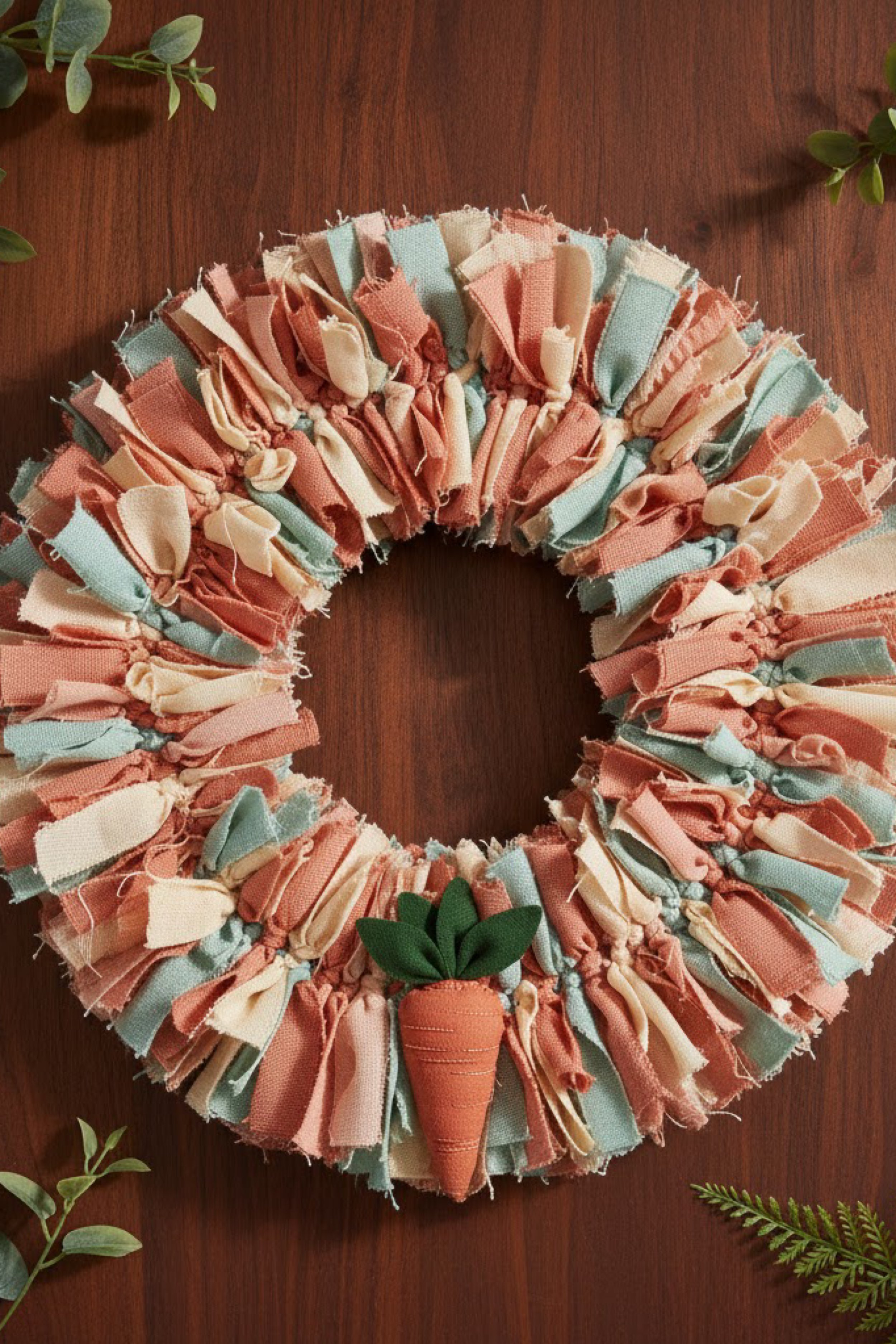 This tutorial recreates a plush rag wreath in warm spring tones with a cute carrot accent at the bottom center. The wreath is built from tied fabric strips that create a thick, fringed texture, then finished with a small fabric carrot that reads playful but still styled. The photo palette leans coral, dusty rose, cream, and soft seafoam, which gives a gentle spring vibe without looking overly bright.