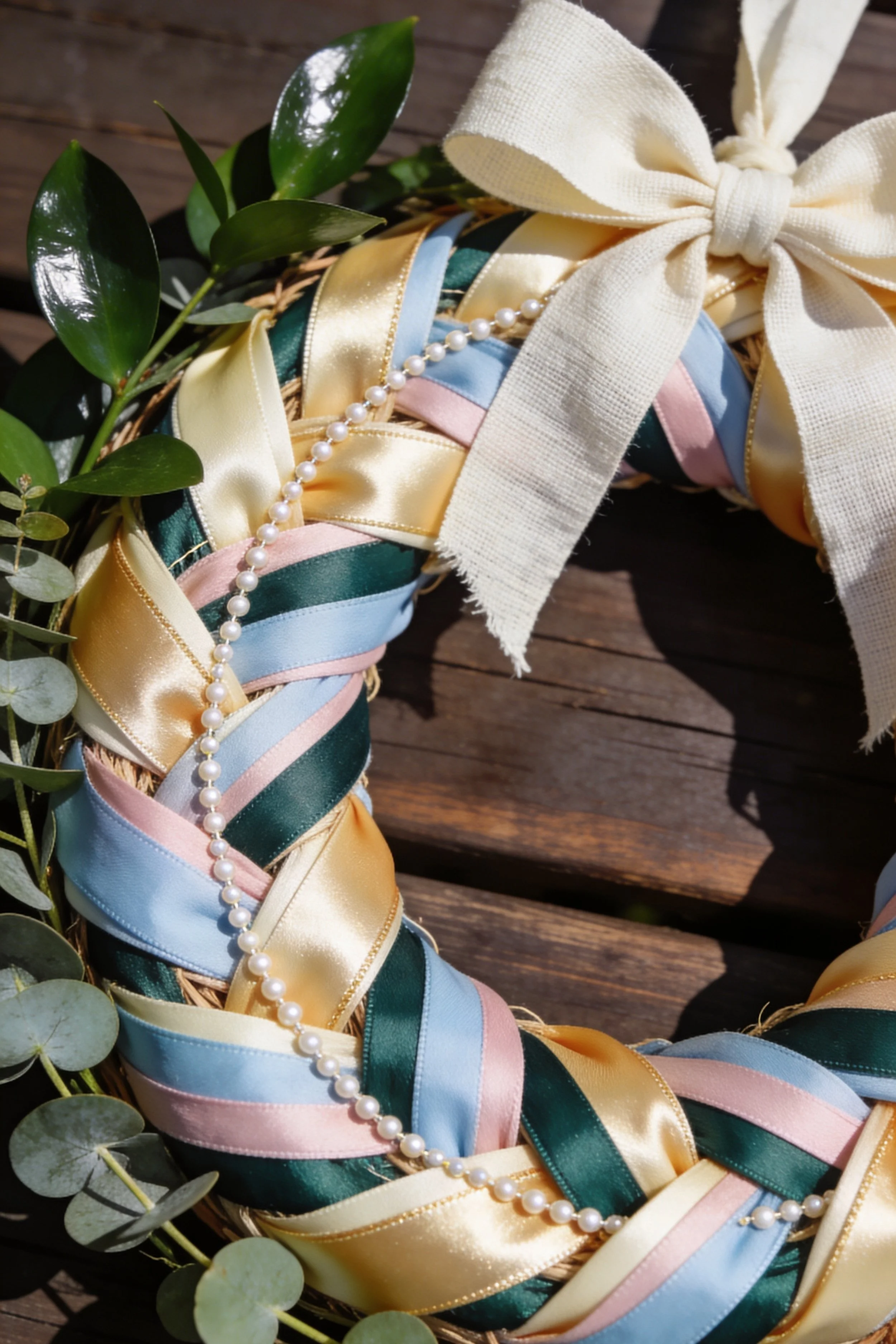 - Tuck in faux eucalyptus stems at two side points, keeping it minimal so bows remain the star.