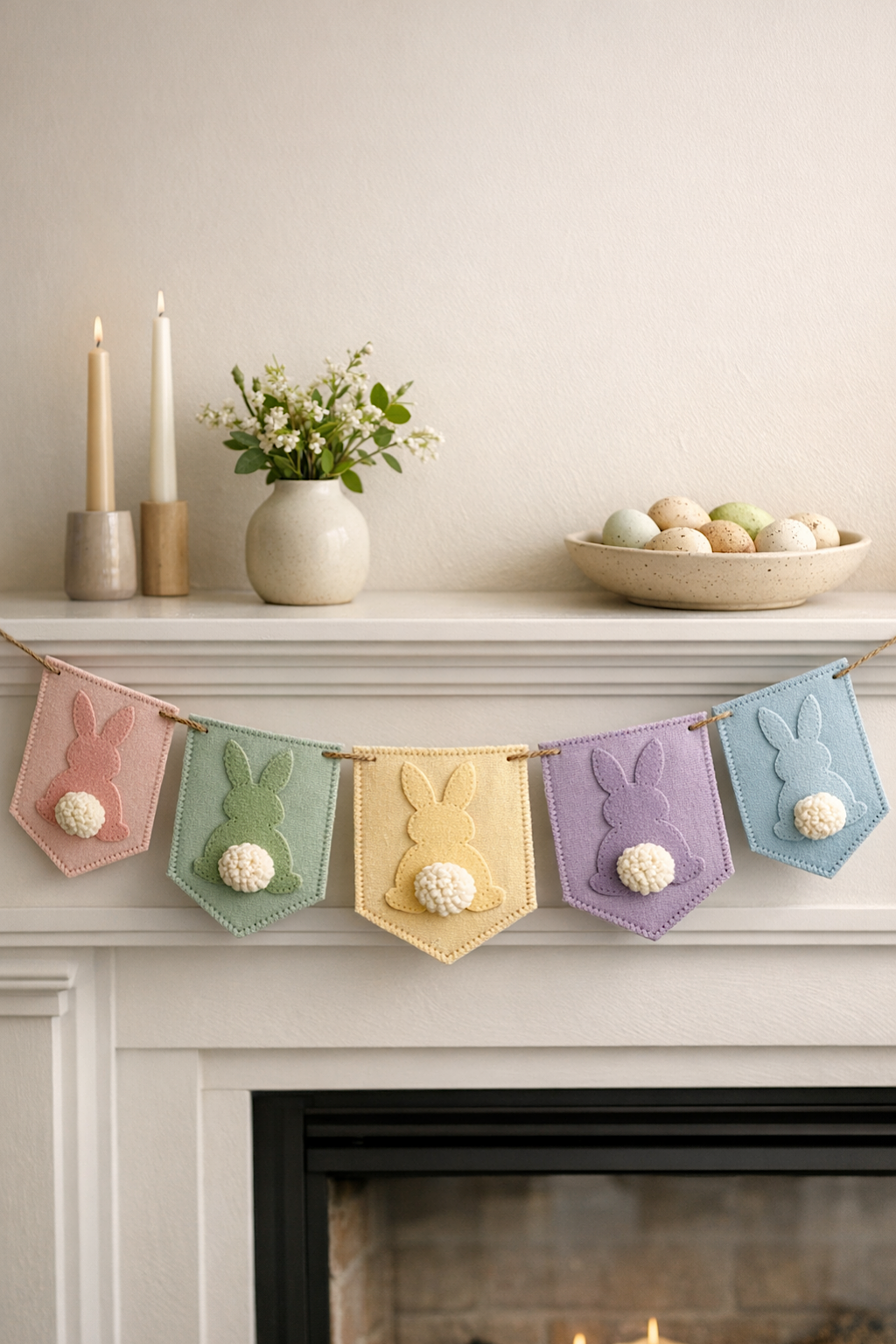 Once your garland is finished, the styling can be just as fun as the making. These bunny banners pair beautifully with bud vases, speckled eggs, taper candles, spring branches, and simple ceramic bowls, which means you can build an entire little seasonal vignette around them without spending much. They also store easily, making them the kind of handmade decoration you will actually look forward to bringing back out each year. That reusable, keepsake quality is part of what makes them feel so special.