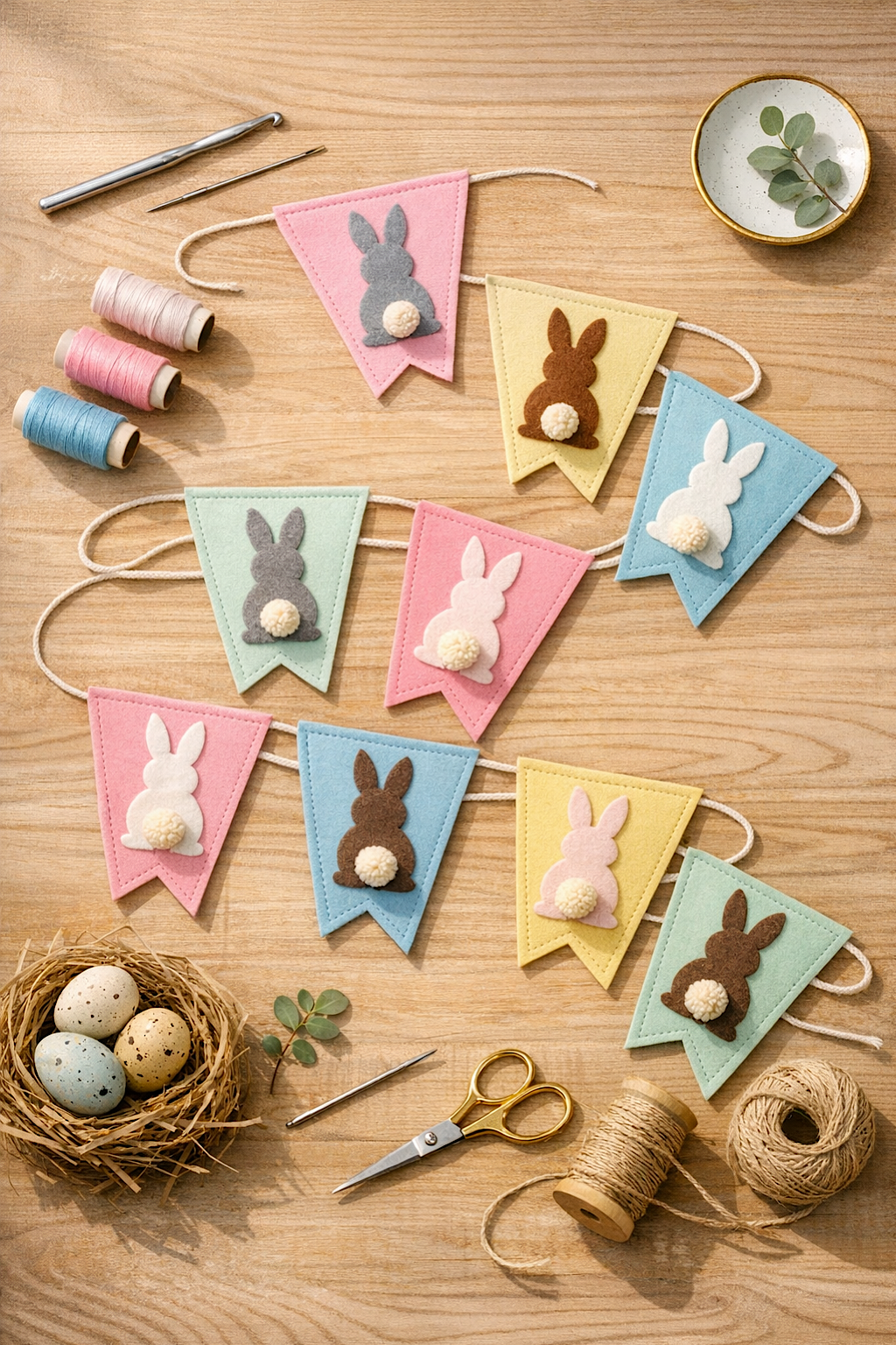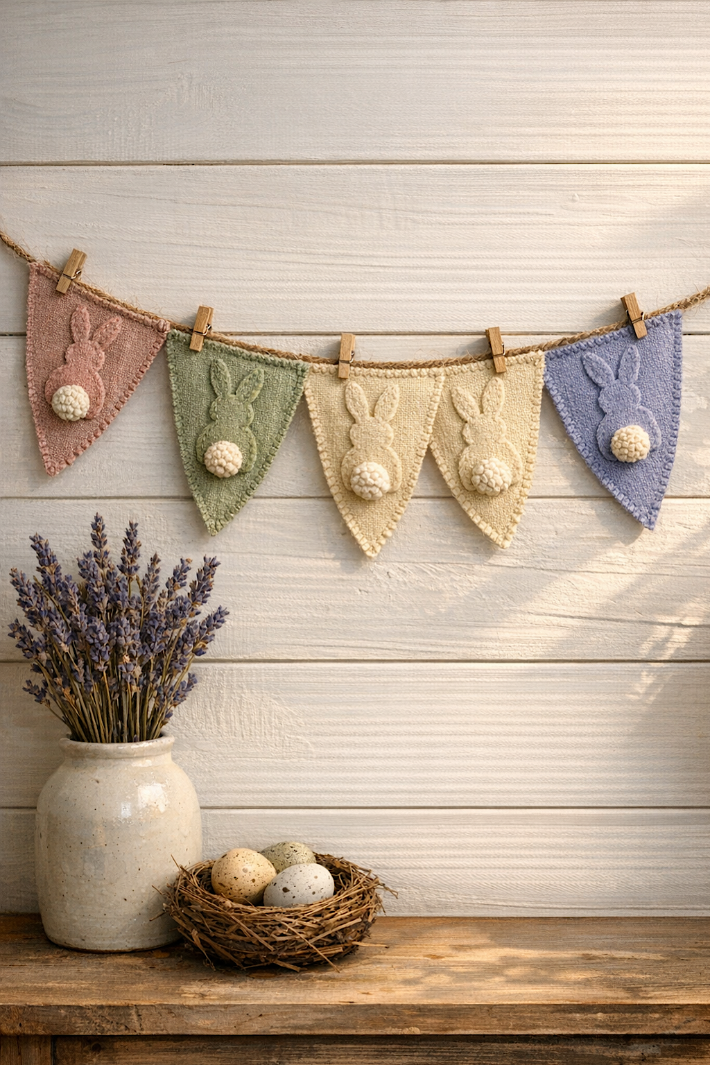You’re making a textured bunny flag garland with a more rustic handmade finish, clipped to twine and styled against light wood planks. This version feels slightly more cottage inspired than the others because the pennants are textured, the twine is visible, and the display uses tiny clothespins rather than threaded holes. It is still soft and pastel, but the overall mood is a little warmer and more homespun.