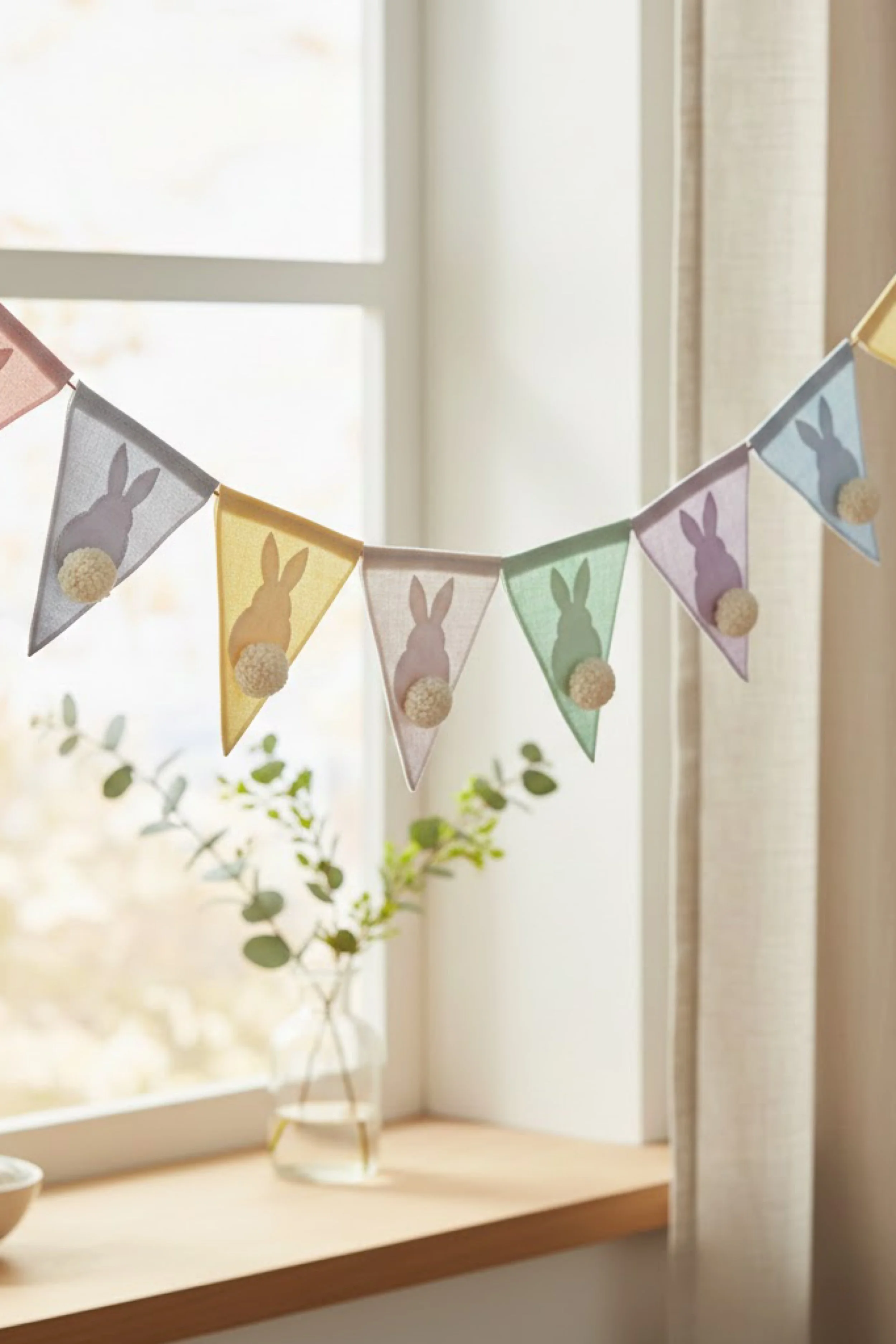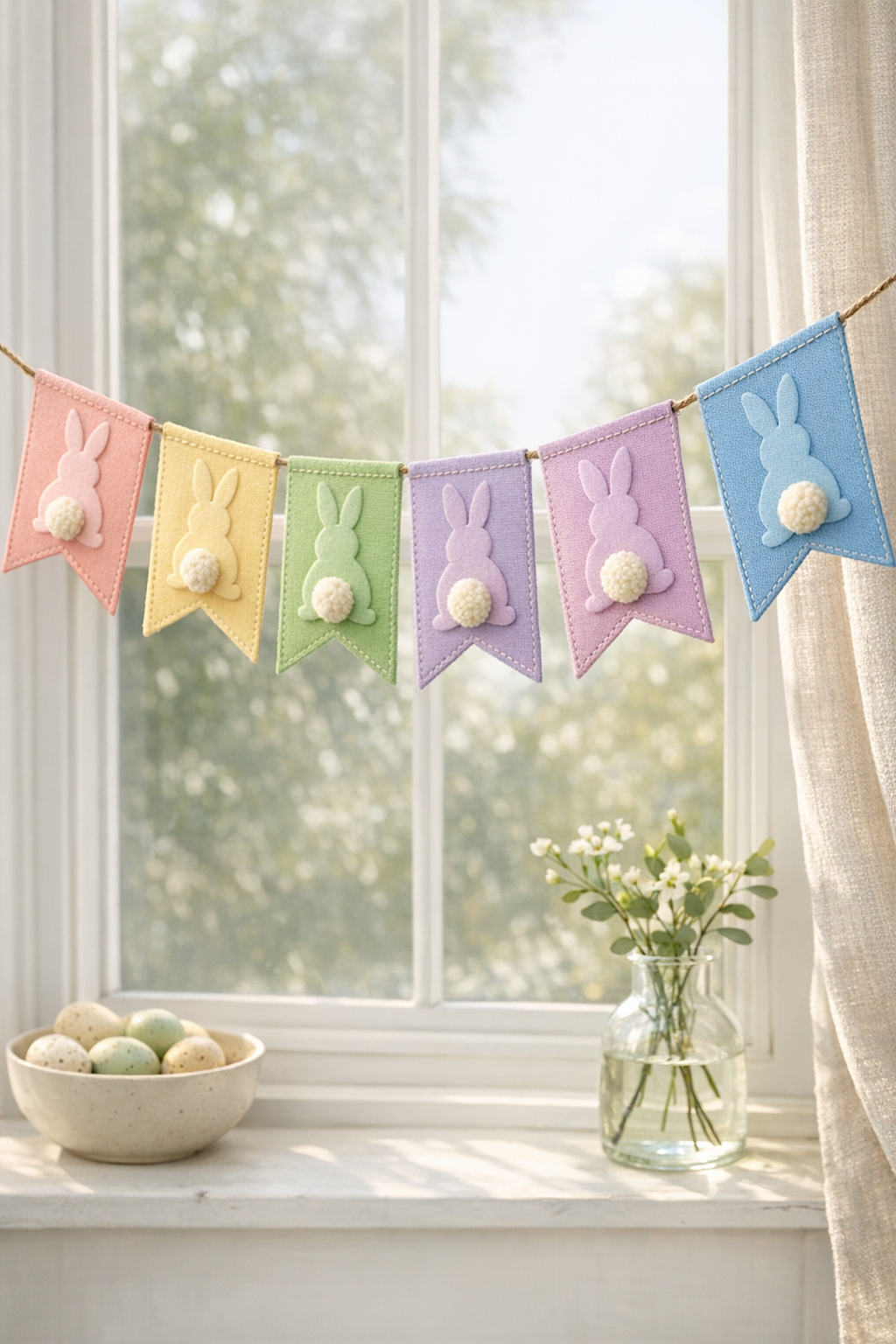 You’re making a soft pastel Easter garland with triangular fabric flags, simple bunny silhouettes, and fluffy little pom pom tails that give the whole piece a sweet handmade storybook look. The version in the photo feels airy, light, and modern, with a gentle curve across the window and a palette of blush pink, butter yellow, mint, lavender, pale blue, and soft gray. This project is wonderfully beginner friendly because each flag is small, the shapes are simple, and the charm comes from clean finishing and color balance rather than difficult techniques.