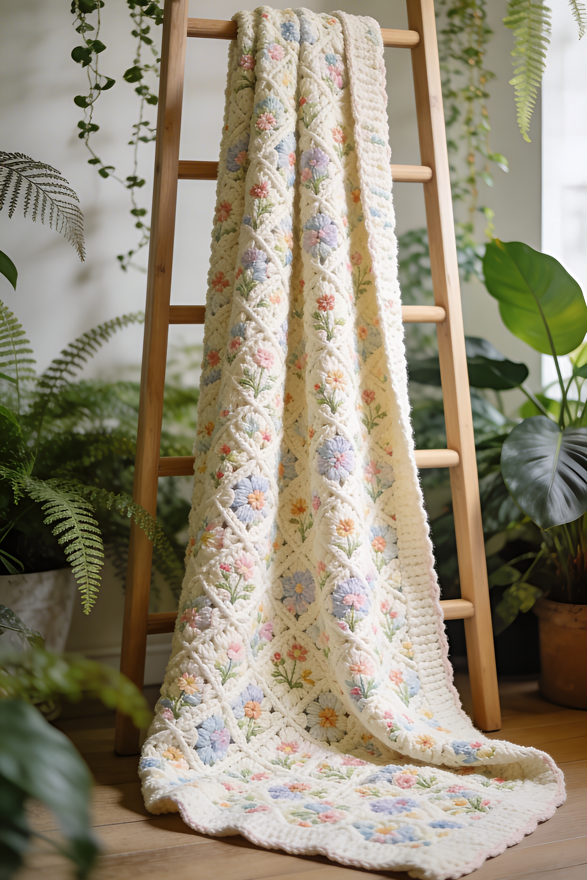 Weave in ends deeply through neighboring stitches because an openwork throw reveals loose tails easily. After blocking, store rolled rather than tightly folded to protect the raised lattice. For display, drape it on a blanket ladder where the center column of flowers remains visible. If washing, do so gently and reshape every lattice diamond while damp. You can also lightly stitch the lower corners to help the border maintain a graceful line over time. The more carefully you finish, the more convincing that heirloom boutique feel becomes.