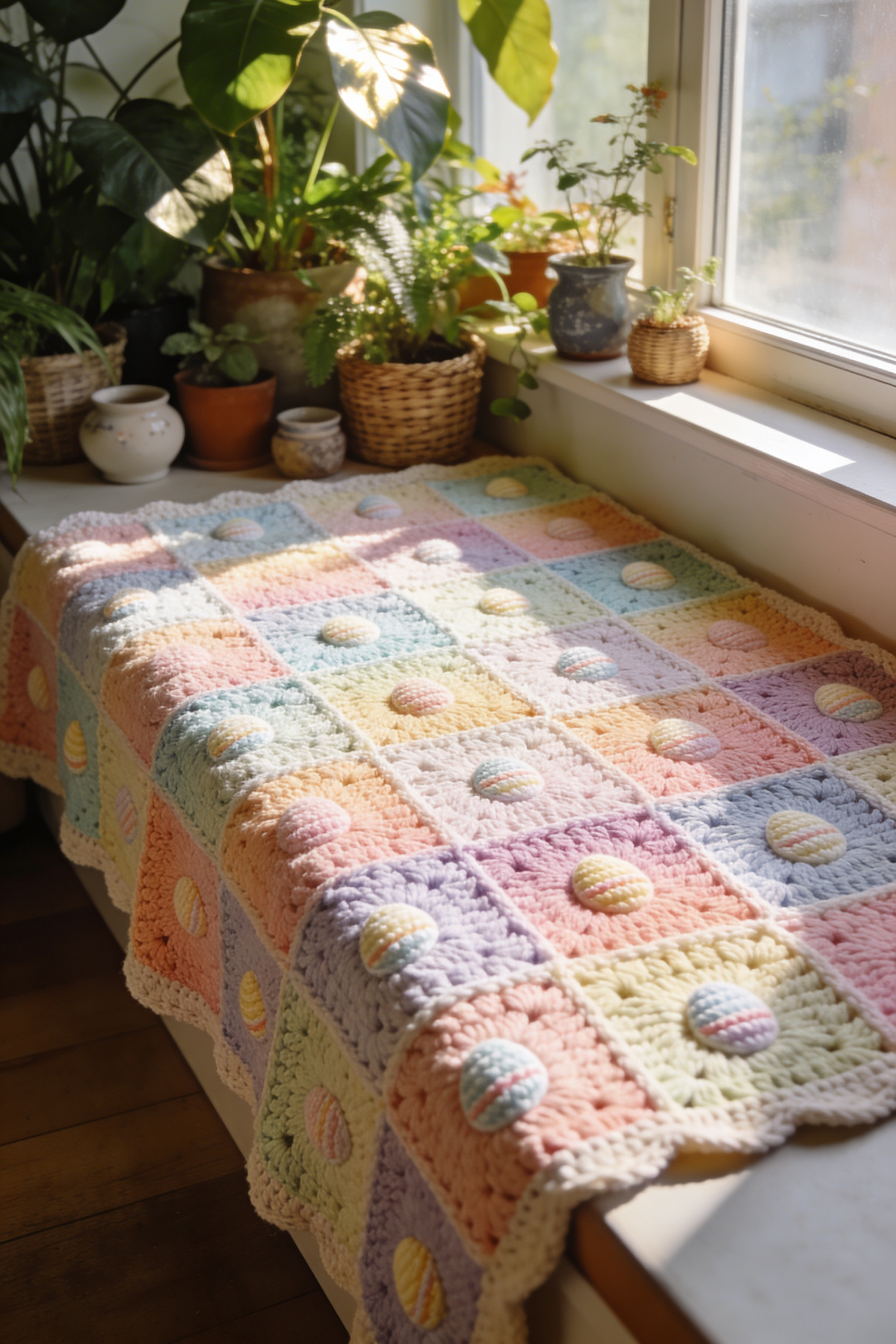 You are making a cheerful pastel crochet blanket built from soft granny style squares, each centered with a raised Easter egg motif. The finished look is playful but still refined because the palette stays airy and powdery instead of loud. It is the kind of seasonal throw that brightens a window seat, bench, child’s room, or spring entry without feeling temporary or costume like.