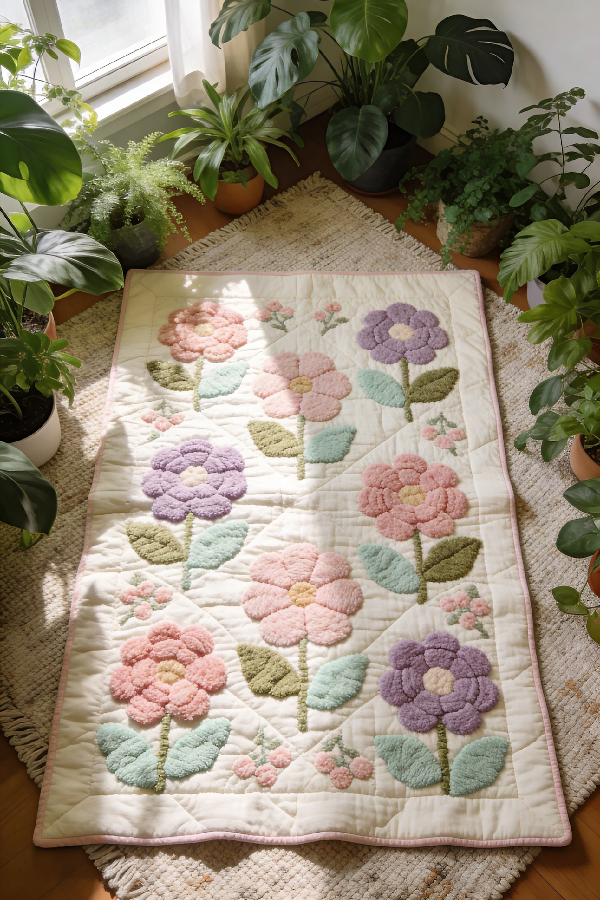 You are making a soft quilted floor mat or baby sized blanket with oversized pastel flowers that look gently tufted or chenille textured against a creamy background. The design in the photo feels sweet and graphic at the same time, with simple floral shapes arranged in neat rows and framed by a pale pink binding. It is perfect as a nursery play mat, spring nap blanket, or decorative floor quilt in a bright plant filled room.