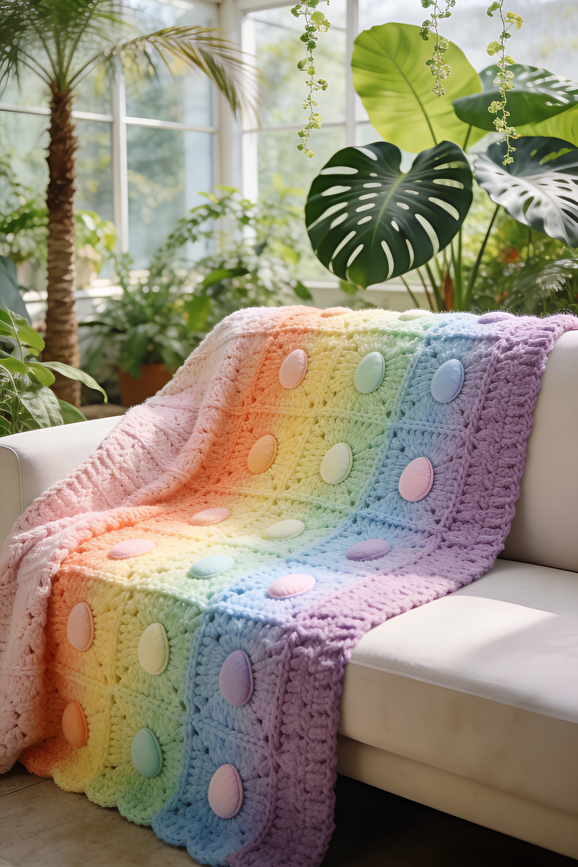 This project is a dreamy rainbow pastel throw made from plush crochet squares and topped with smooth raised oval motifs that look like candy eggs or little macarons. The blanket reads modern and playful at the same time because the gradient color flow is soft and the embellishments are neatly spaced. It is perfect for a sofa corner, nursery chair, or springtime reading nook where you want something bright, tactile, and cozy.