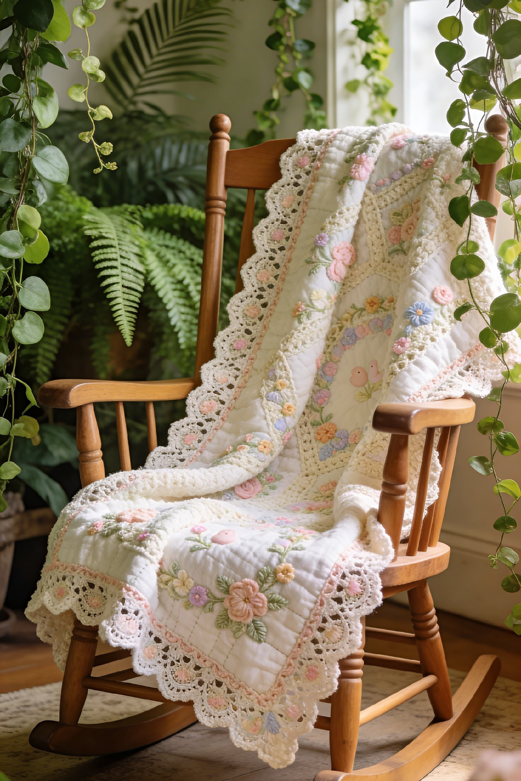You are making a soft heirloom style spring throw that looks part vintage quilt and part hand crocheted lace treasure. The look in the photo combines creamy quilted fabric, pastel floral embroidery or appliqué, a sweet central motif, and a scalloped crocheted trim that frames the whole piece like a delicate doily. The finished result feels romantic, cottage inspired, and especially beautiful draped over a rocker, crib rail, or guest bed in a plant filled sunroom.