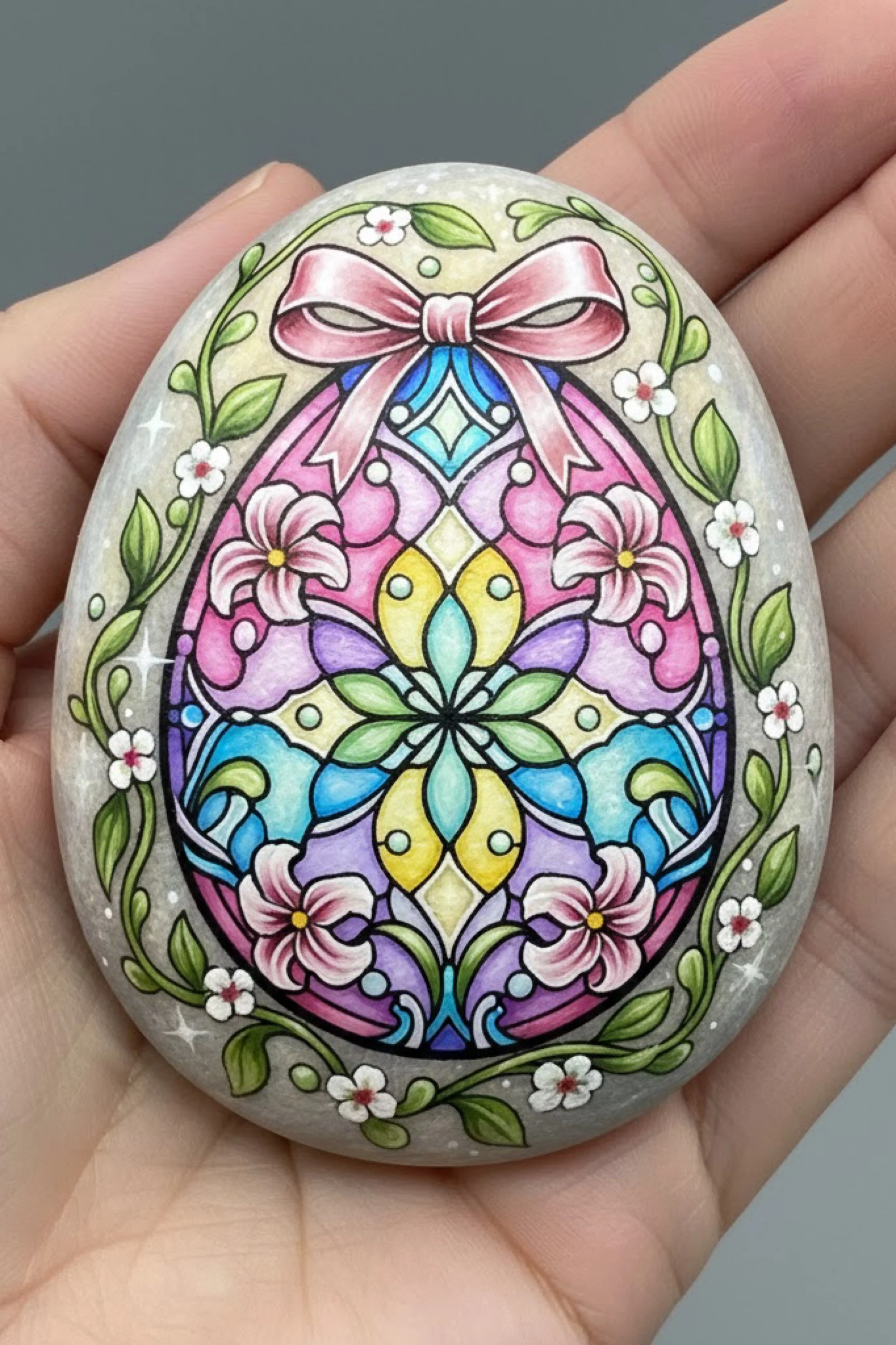 You’re painting a decorative Easter egg motif that looks like pastel stained glass set into a smooth stone, framed with curling vines, tiny blossoms, and a soft pink bow at the top. This design is more graphic and symmetrical than the storybook scenes in the other rocks, which makes it a beautiful contrast in a spring painted stone collection. The finished result feels elegant, polished, and almost jewelry like.