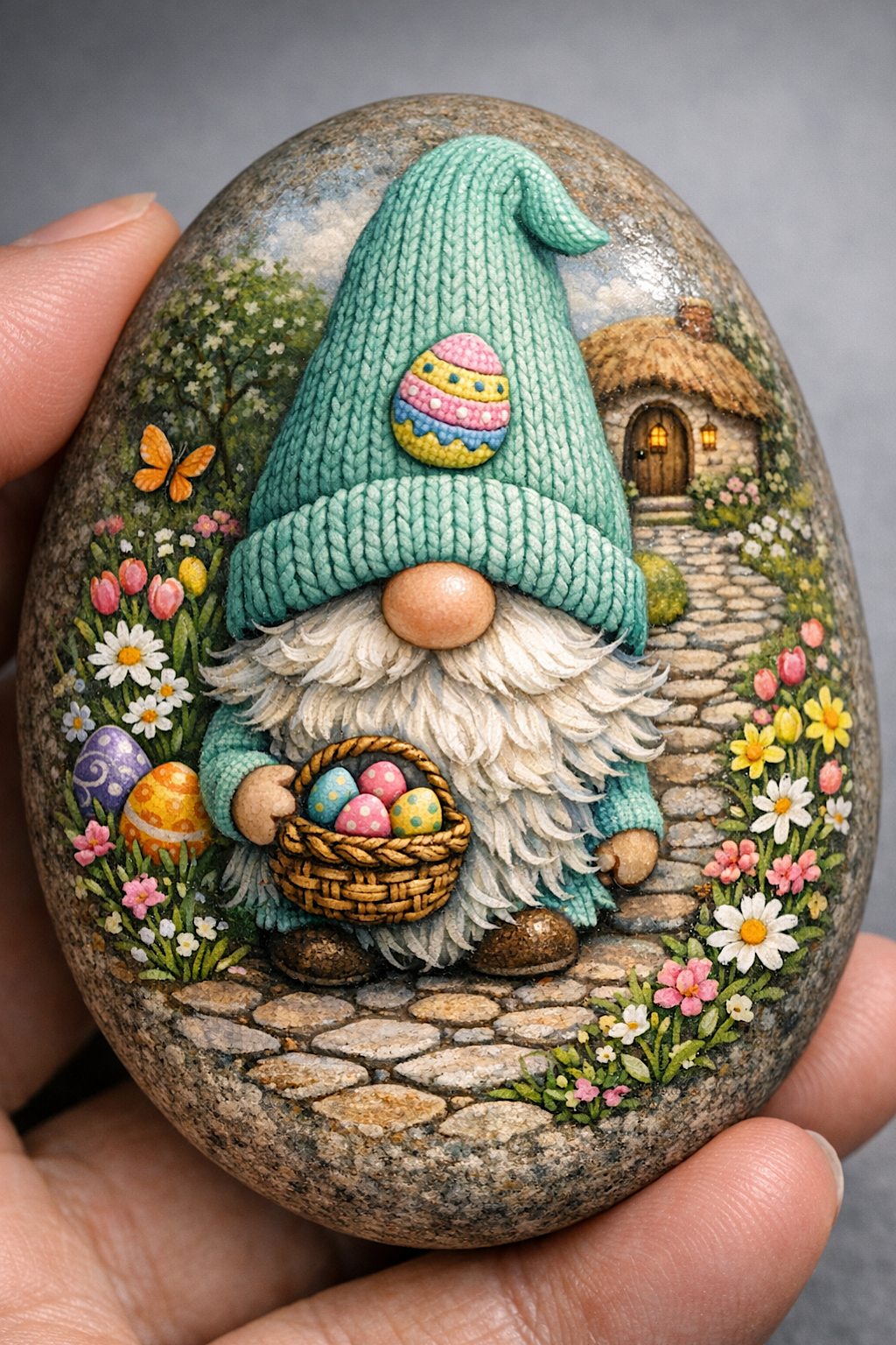 You’re painting a storybook style Easter gnome on a smooth egg shaped rock, complete with a mint hat, fluffy beard, tiny basket of pastel eggs, and a flower lined cottage path in the background. The finished look feels richly illustrated and almost dimensional, even though it is created with careful layering, shading, and fine detail work. This is a wonderful project for spring décor, Easter basket fillers, mantel styling, or gifting to someone who loves cottagecore charm.