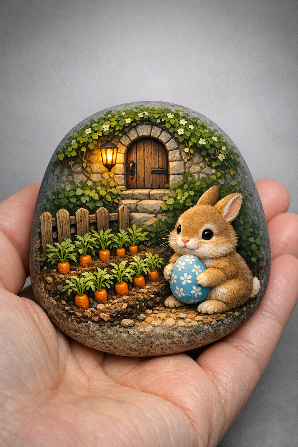 Optional upgrades include adding a second little bunny footprint trail in the soil, painting a floral wreath around the doorway, personalizing the egg with initials, or extending the carrot bed with tiny radishes and herbs. You could even make a whole collection of bunny life scenes using the same stone size and palette.