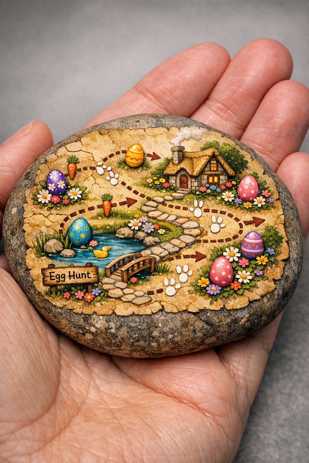 A rock around 4 inches tall gives you enough room for the gnome, basket, path, flowers, and cottage. Smaller stones can still work, but you may want to simplify the garden and reduce the number of eggs in the basket. If yours is wider than the photo, expand the flower beds and make the path curve more dramatically. If yours is taller and narrow, elongate the hat and keep the beard more tapered.