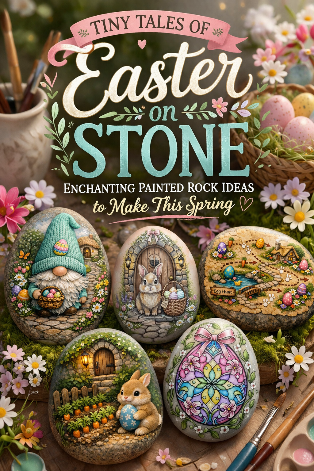 There is something especially magical about painted rocks at Easter. Maybe it is the way a smooth stone already feels a little treasure like in your hand, or maybe it is how easily a tiny spring world can bloom across such a small surface. In this collection, Easter becomes miniature and storybook sweet, with cottage doors, garden paths, pastel eggs, bunnies, gnomes, and stained glass inspired details all tucked onto stone in ways that feel both whimsical and surprisingly elegant.