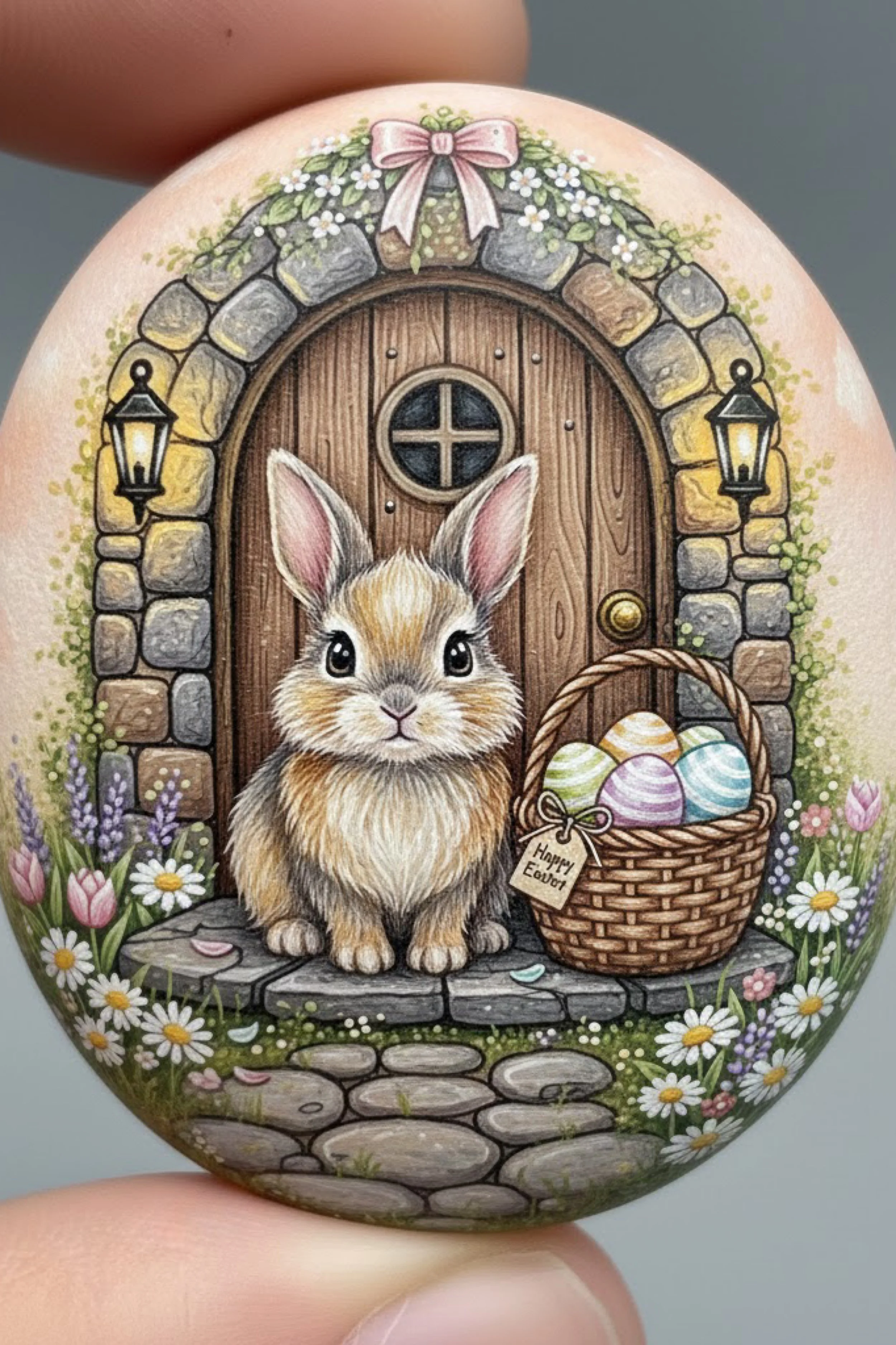 Use a very fine brush or paint pen to place tiny highlights on the lantern glass, stone step edges, bunny eye, egg curves, and a few leaf tips. Then let everything dry completely and seal with two or three thin coats of matte or satin varnish.