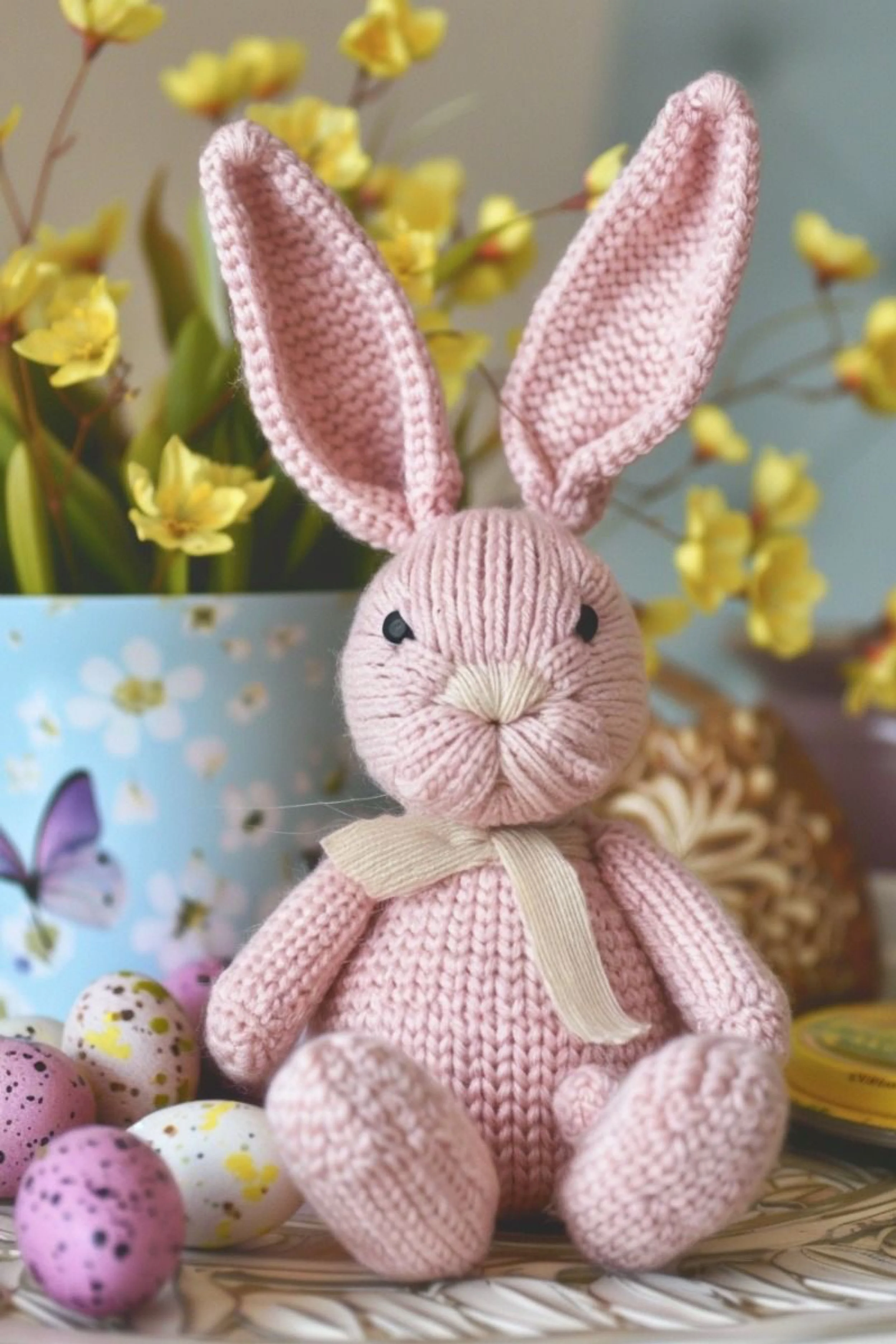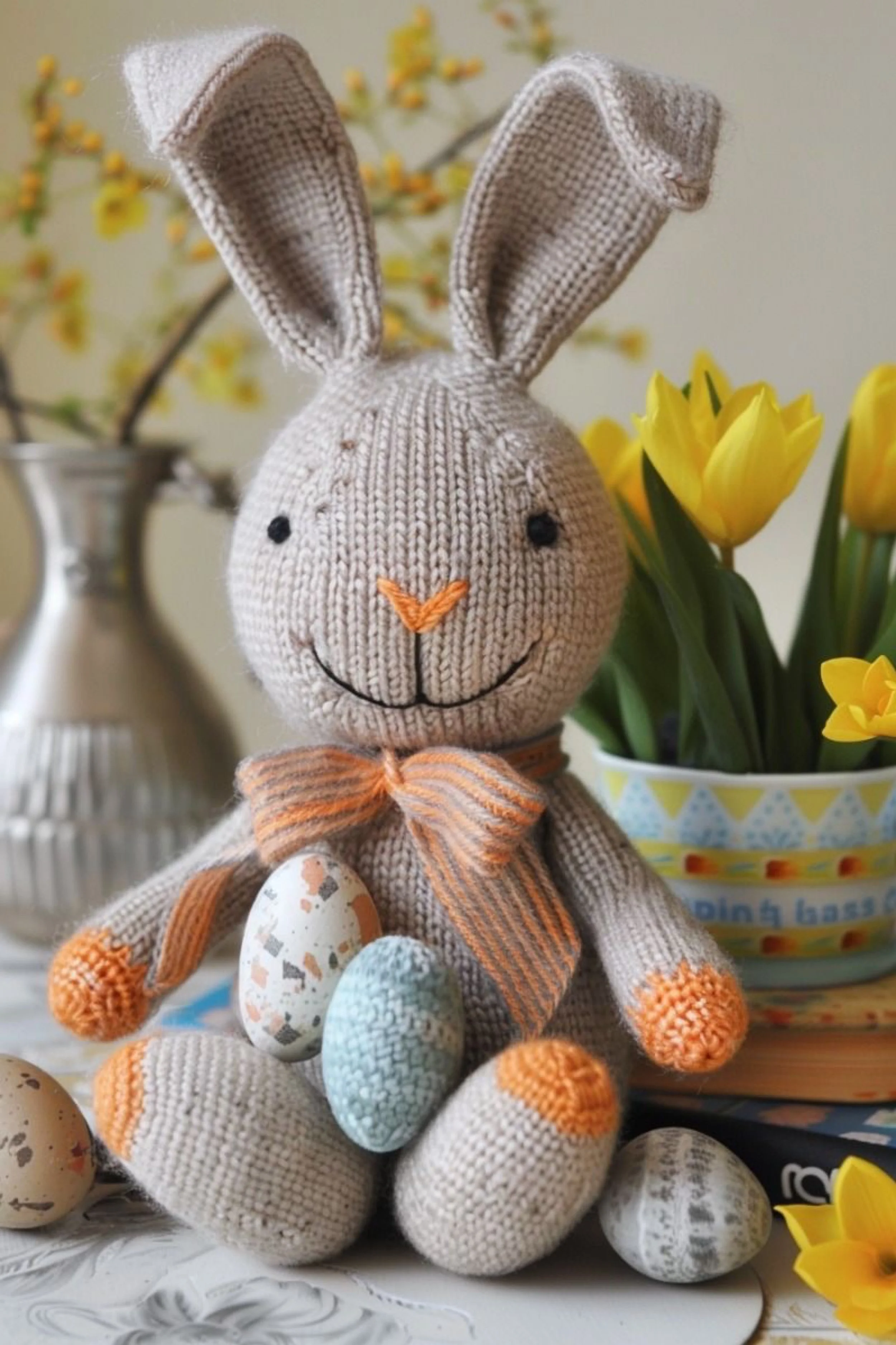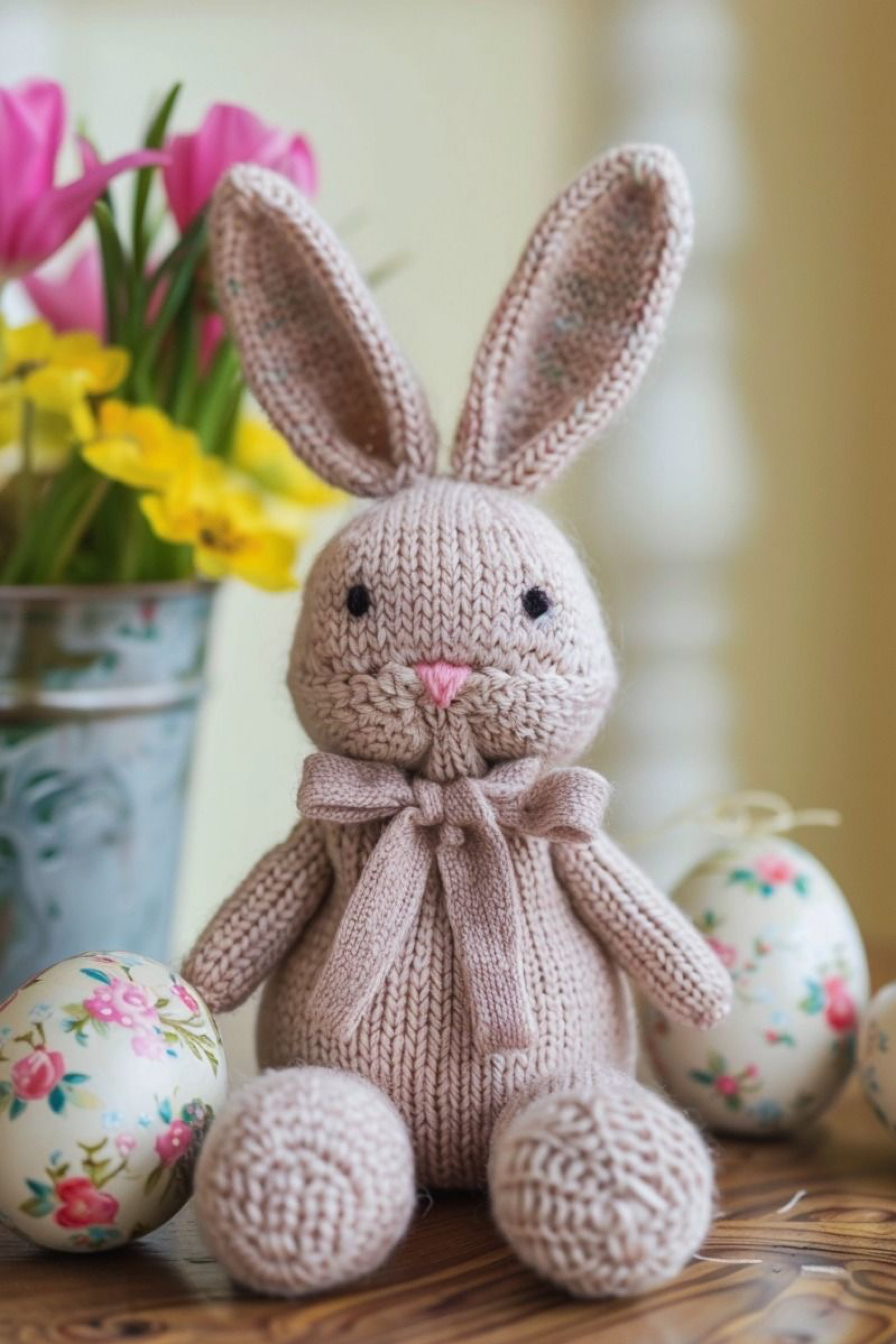 Place your finished bunny among painted eggs, yellow tulips, and a neutral tabletop vignette. The styling helps the bunny feel like an editorial object rather than only a toy. Set it slightly forward, angle the feet outward, and let the scarf bow rest naturally.