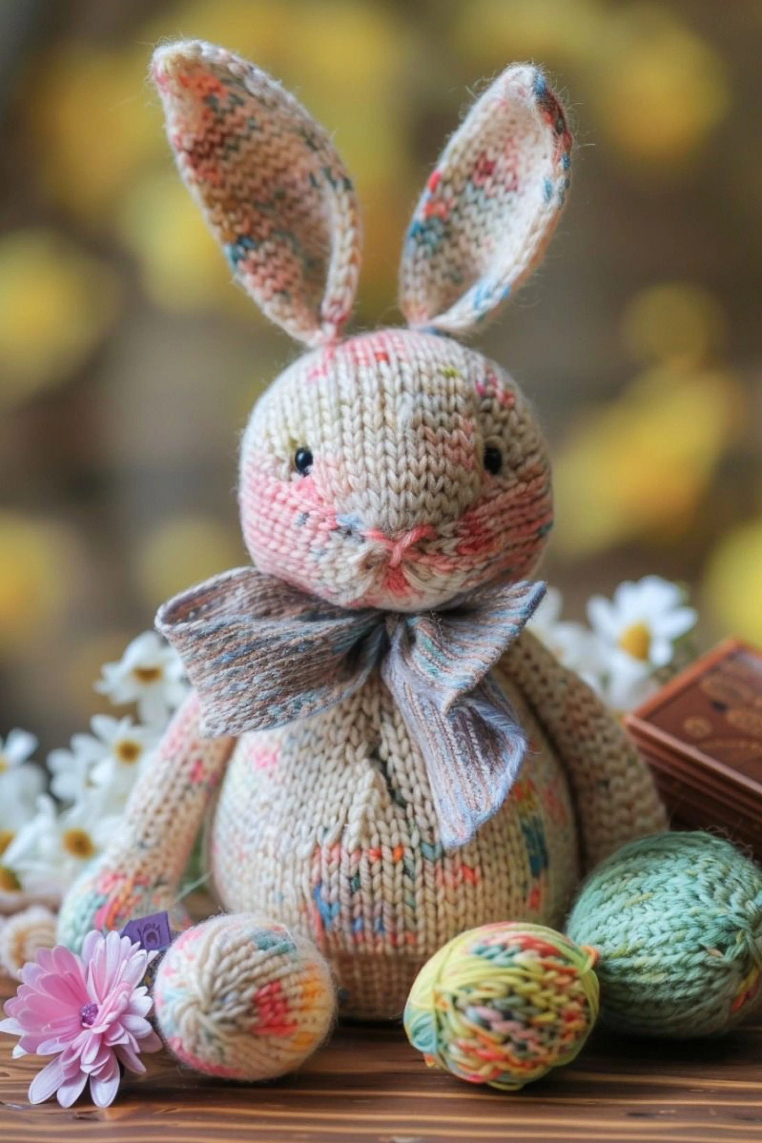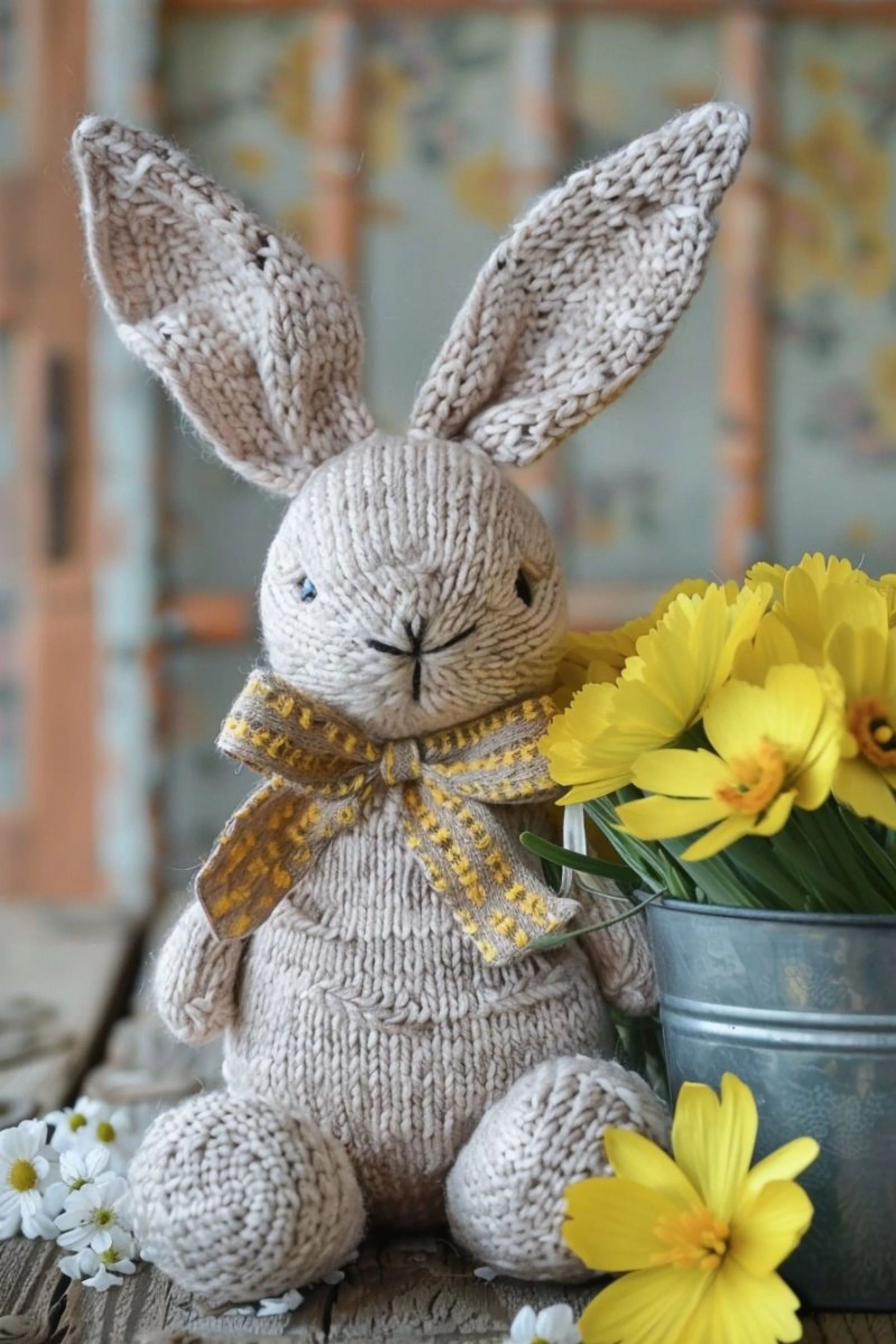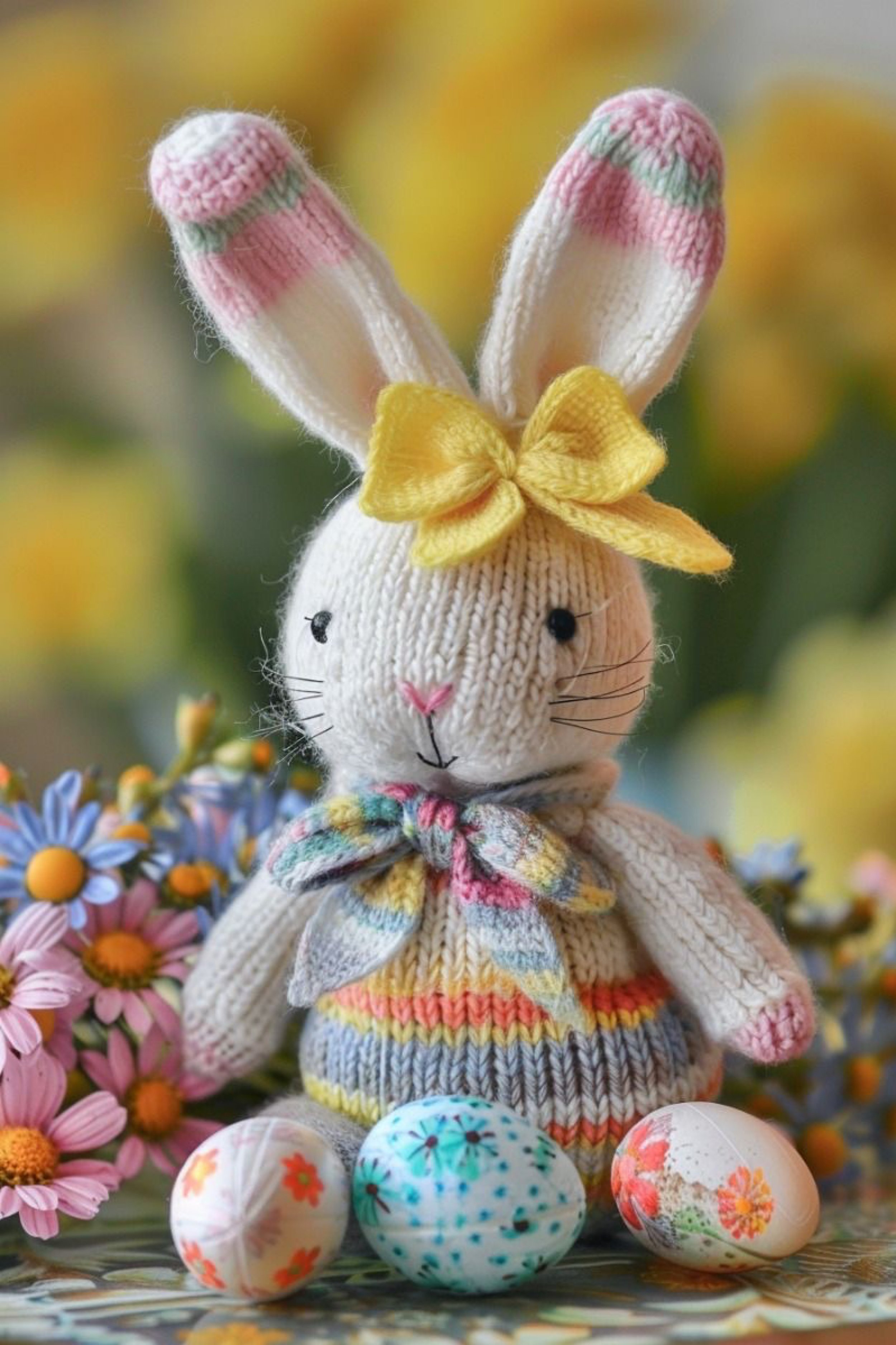 Place your finished bunny among painted eggs, yellow tulips, and a neutral tabletop vignette. The styling helps the bunny feel like an editorial object rather than only a toy. Set it slightly forward, angle the feet outward, and let the scarf bow rest naturally.