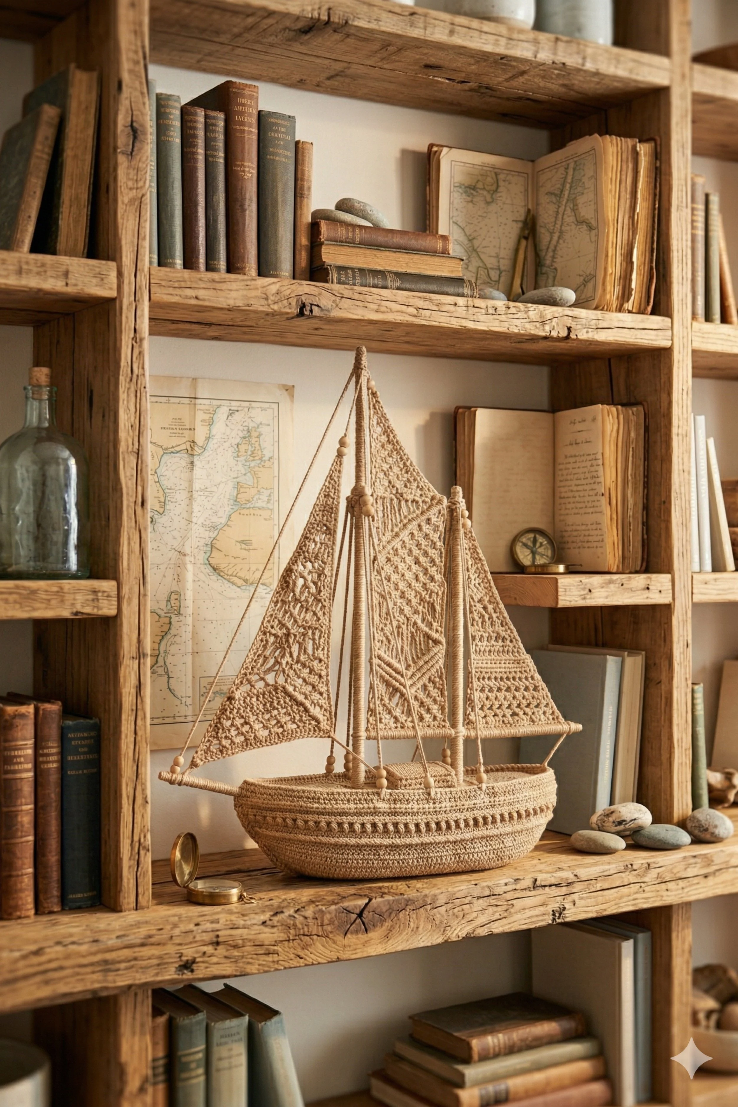 Plan for a finished boat around 14 to 20 inches wide and 16 to 22 inches tall if you want the same full shelf presence as the photo. This version can handle a little more embellishment than the others, so it is a good choice if you love detail. Make it simpler by omitting beads and extra rigging. Make it more adventurous by adding a small rolled map, tiny cord coil, or miniature pebbles around the display setting instead of on the boat itself.