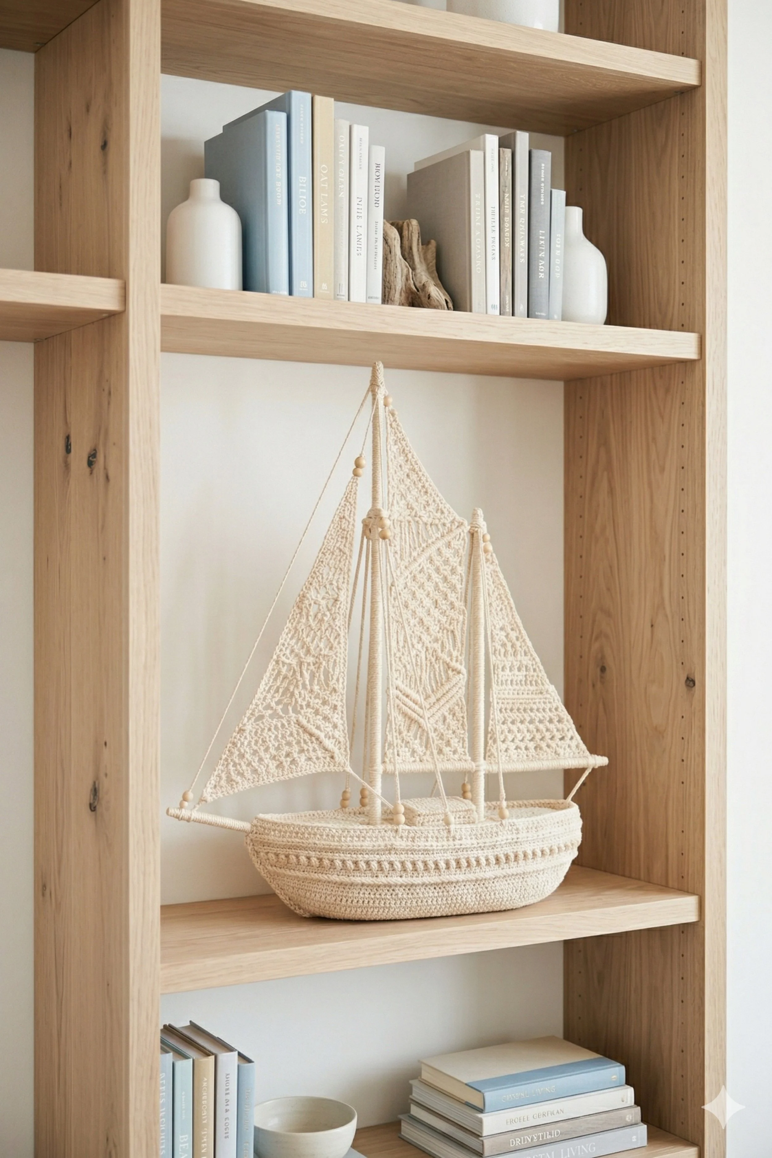 A finished size around 8 to 12 inches wide and 10 to 14 inches tall suits the shelf scale in the photo. The hull here is smaller and more compact than the first image, so keep the base modest. If you want to enlarge it, add extra rounds to the oval base and one or two more rows to each sail triangle. For a more graphic modern version, make the hull in soft white and the sails in pale flax. For a child’s room, keep the same shape but add a tiny pennant at the mast top.