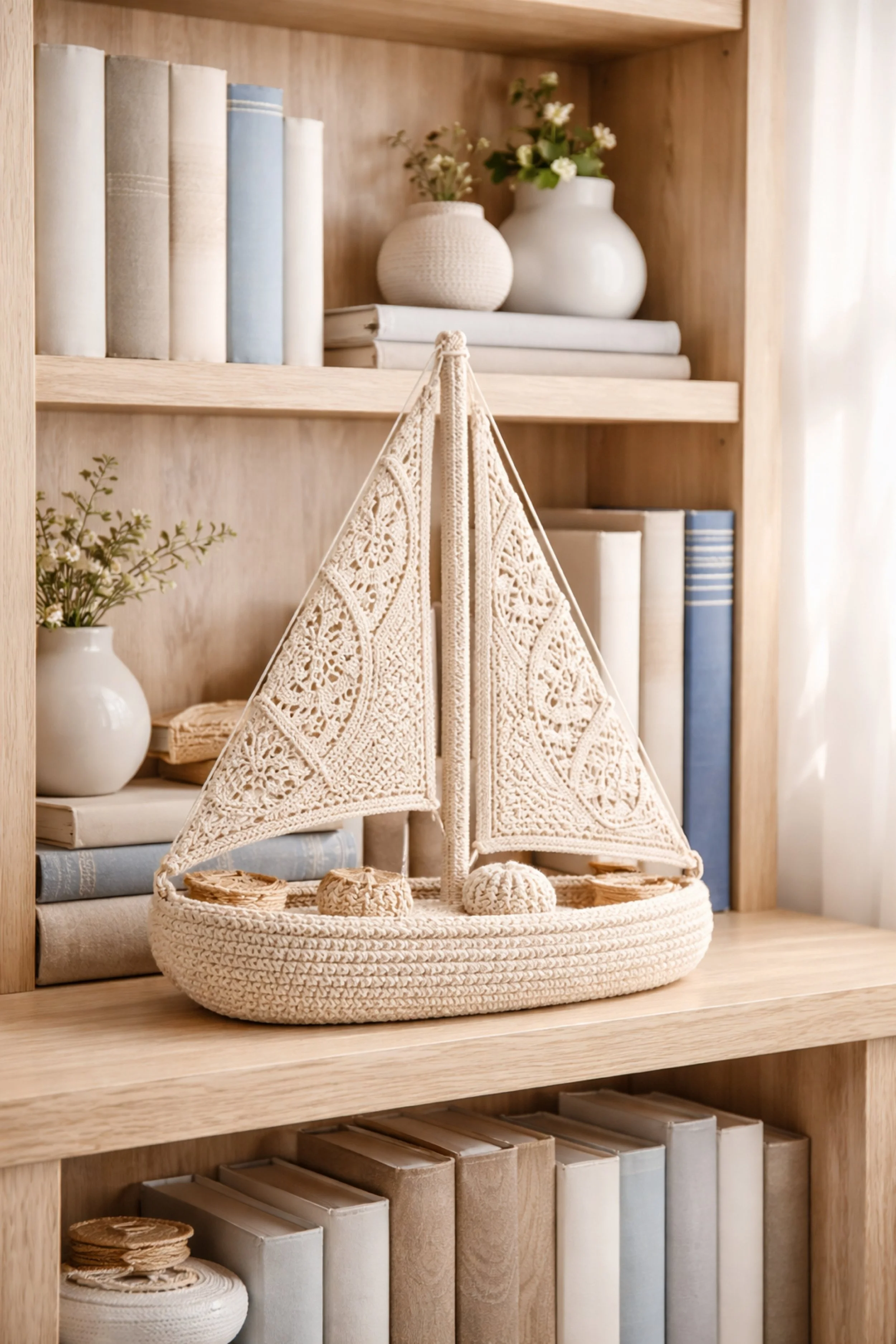 These sailboats are especially lovely for styling bookcases, entry tables, nursery shelves, reading nooks, and seasonal summer displays. What makes this collection feel special is the way crochet becomes sculptural here. The hulls read like little woven vessels, the sails add delicate architectural shape, and the finished pieces feel thoughtful, decorative, and surprisingly elevated. Whether you want something bright and Scandinavian, warm and vintage, or textured and coastal, you will find a version that fits your space and your crafting style.